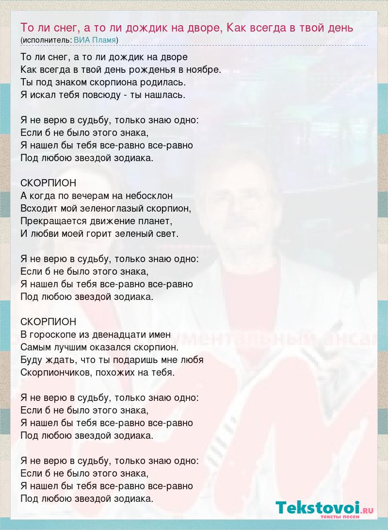 То ли снег, а то ли дождик на дворе Как всегда в твой день рожденья в ноябре. Ты под знаком скорпиона родилась. Я искал тебя повсюду - ты нашлась. Я не верю в судьбу, только знаю одно: Если б не было этого знака, Я нашел бы тебя все-равно все-равно Под любою звездой зодиака. СКОРПИОН А когда по вечерам на небосклон Всходит мой зеленоглазый скорпион, Прекращается движение планет, И любви моей горит зеленый свет. Я не верю в судьбу, только знаю одно: Если б не было этого знака, Я нашел бы тебя все-равно все-равно Под любою звездой зодиака. СКОРПИОН В гороскопе из двенадцати имен Самым лучшим оказался скорпион. Буду ждать, что ты подаришь мне любя Скорпиончиков, похожих на тебя. Я не верю в судьбу, только знаю одно: Если б не было этого знака, Я нашел бы тебя все-равно все-равно Под любою звездой зодиака. Я не верю в судьбу, только знаю одно: Если б не было этого знака, Я нашел бы тебя все-равно все-равно Под любою звездой зодиака.