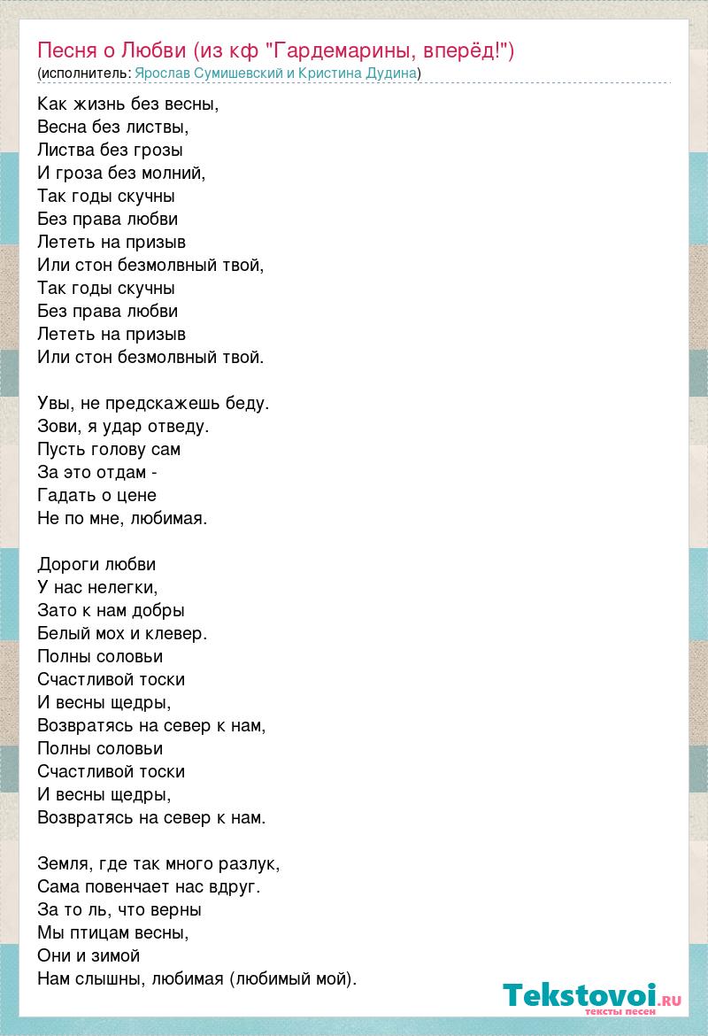 Как жизнь без весны, Весна без листвы, Листва без грозы И гроза без молний, Так годы скучны Без права любви Лететь на призыв Или стон безмолвный твой, Так годы скучны Без права любви Лететь на призыв Или стон безмолвный твой. Увы, не предскажешь беду. Зови, я удар отведу. Пусть голову сам За это отдам - Гадать о цене Не по мне, любимая. Дороги любви У нас нелегки, Зато к нам добры Белый мох и клевер. Полны соловьи Счастливой тоски И весны щедры, Возвратясь на север к нам, Полны соловьи Счастливой тоски И весны щедры, Возвратясь на север к нам. Земля, где так много разлук, Сама повенчает нас вдруг. За то ль, что верны Мы птицам весны, Они и зимой Нам слышны, любимая (любимый мой).