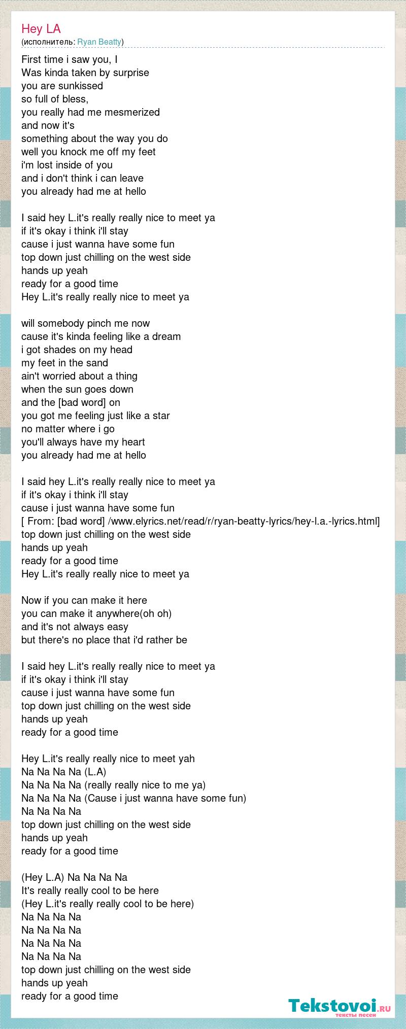 First time i saw you, I Was kinda taken by surprise you are sunkissed so full of bless, you really had me mesmerized and now it's something about the way you do well you knock me off my feet i'm lost inside of you and i don't think i can leave you already had me at hello I said hey L.it's really really nice to meet ya if it's okay i think i'll stay cause i just wanna have some fun top down just chilling on the west side hands up yeah ready for a good time Hey L.it's really really nice to meet ya will somebody pinch me now cause it's kinda feeling like a dream i got shades on my head my feet in the sand ain't worried about a thing when the sun goes down and the lights come on you got me feeling just like a star no matter where i go you'll always have my heart you already had me at hello I said hey L.it's really really nice to meet ya if it's okay i think i'll stay cause i just wanna have some fun [ From: [bad word] /www.elyrics.net/read/r/ryan-beatty-lyrics/hey-l.a.-lyrics.html] top down just chilling on the west side hands up yeah ready for a good time Hey L.it's really really nice to meet ya Now if you can make it here you can make it anywhere(oh oh) and it's not always easy but there's no place that i'd rather be I said hey L.it's really really nice to meet ya if it's okay i think i'll stay cause i just wanna have some fun top down just chilling on the west side hands up yeah ready for a good time Hey L.it's really really nice to meet yah Na Na Na Na (L.A) Na Na Na Na (really really nice to me ya) Na Na Na Na (Cause i just wanna have some fun) Na Na Na Na top down just chilling on the west side hands up yeah ready for a good time (Hey L.A) Na Na Na Na It's really really cool to be here (Hey L.it's really really cool to be here) Na Na Na Na Na Na Na Na Na Na Na Na Na Na Na Na top down just chilling on the west side hands up yeah ready for a good time