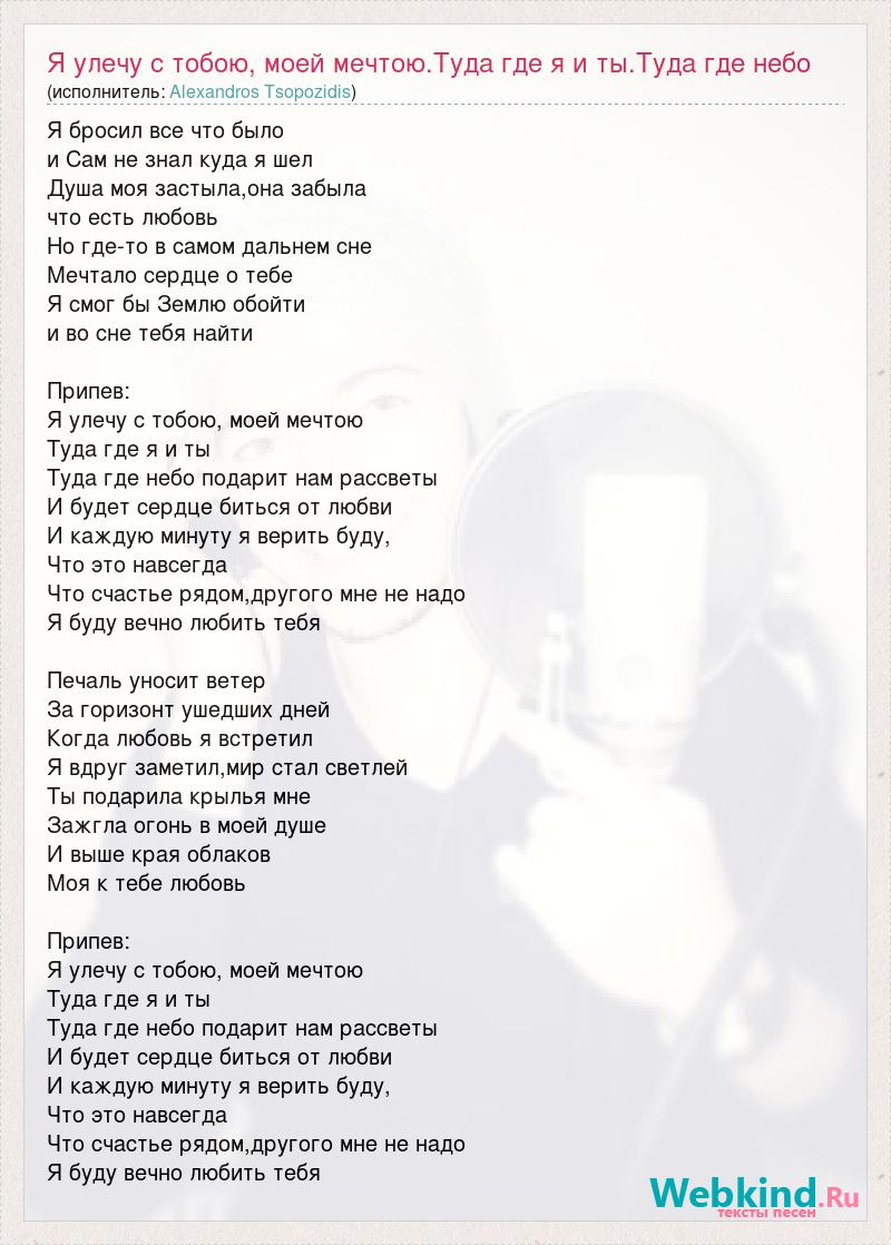 Я бросил все что было и Сам не знал куда я шел Душа моя застыла,она забыла что есть любовь Но где-то в самом дальнем сне Мечтало сердце о тебе Я смог бы Землю обойти и во сне тебя найти Припев: Я улечу с тобою, моей мечтою Туда где я и ты Туда где небо подарит нам рассветы И будет сердце биться от любви И каждую минуту я верить буду, Что это навсегда Что счастье рядом,другого мне не надо Я буду вечно любить тебя Печаль уносит ветер За горизонт ушедших дней Когда любовь я встретил Я вдруг заметил,мир стал светлей Ты подарила крылья мне Зажгла огонь в моей душе И выше края облаков Моя к тебе любовь Припев: Я улечу с тобою, моей мечтою Туда где я и ты Туда где небо подарит нам рассветы И будет сердце биться от любви И каждую минуту я верить буду, Что это навсегда Что счастье рядом,другого мне не надо Я буду вечно любить тебя