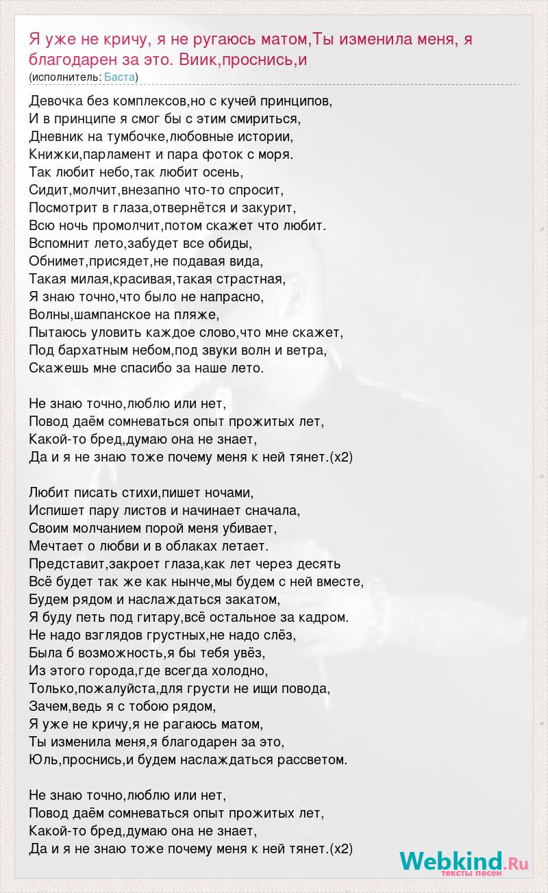 Девочка без комплексов,но с кучей принципов, И в принципе я смог бы с этим смириться, Дневник на тумбочке,любовные истории, Книжки,парламент и пара фоток с моря. Так любит небо,так любит осень, Сидит,молчит,внезапно что-то спросит, Посмотрит в глаза,отвернётся и закурит, Всю ночь промолчит,потом скажет что любит. Вспомнит лето,забудет все обиды, Обнимет,присядет,не подавая вида, Такая милая,красивая,такая страстная, Я знаю точно,что было не напрасно, Волны,шампанское на пляже, Пытаюсь уловить каждое слово,что мне скажет, Под бархатным небом,под звуки волн и ветра, Скажешь мне спасибо за наше лето. Не знаю точно,люблю или нет, Повод даём сомневаться опыт прожитых лет, Какой-то бред,думаю она не знает, Да и я не знаю тоже почему меня к ней тянет.(х2) Любит писать стихи,пишет ночами, Испишет пару листов и начинает сначала, Своим молчанием порой меня убивает, Мечтает о любви и в облаках летает. Представит,закроет глаза,как лет через десять Всё будет так же как нынче,мы будем с ней вместе, Будем рядом и наслаждаться закатом, Я буду петь под гитару,всё остальное за кадром. Не надо взглядов грустных,не надо слёз, Была б возможность,я бы тебя увёз, Из этого города,где всегда холодно, Только,пожалуйста,для грусти не ищи повода, Зачем,ведь я с тобою рядом, Я уже не кричу,я не рагаюсь матом, Ты изменила меня,я благодарен за это, Юль,проснись,и будем наслаждаться рассветом. Не знаю точно,люблю или нет, Повод даём сомневаться опыт прожитых лет, Какой-то бред,думаю она не знает, Да и я не знаю тоже почему меня к ней тянет.(х2)