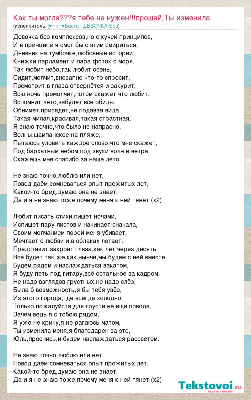 Девочка без комплексов,но с кучей принципов, И в принципе я смог бы с этим смириться, Дневник на тумбочке,любовные истории, Книжки,парламент и пара фоток с моря. Так любит небо,так любит осень, Сидит,молчит,внезапно что-то спросит, Посмотрит в глаза,отвернётся и закурит, Всю ночь промолчит,потом скажет что любит. Вспомнит лето,забудет все обиды, Обнимет,присядет,не подавая вида, Такая милая,красивая,такая страстная, Я знаю точно,что было не напрасно, Волны,шампанское на пляже, Пытаюсь уловить каждое слово,что мне скажет, Под бархатным небом,под звуки волн и ветра, Скажешь мне спасибо за наше лето. Не знаю точно,люблю или нет, Повод даём сомневаться опыт прожитых лет, Какой-то бред,думаю она не знает, Да и я не знаю тоже почему меня к ней тянет.(х2) Любит писать стихи,пишет ночами, Испишет пару листов и начинает сначала, Своим молчанием порой меня убивает, Мечтает о любви и в облаках летает. Представит,закроет глаза,как лет через десять Всё будет так же как нынче,мы будем с ней вместе, Будем рядом и наслаждаться закатом, Я буду петь под гитару,всё остальное за кадром. Не надо взглядов грустных,не надо слёз, Была б возможность,я бы тебя увёз, Из этого города,где всегда холодно, Только,пожалуйста,для грусти не ищи повода, Зачем,ведь я с тобою рядом, Я уже не кричу,я не рагаюсь матом, Ты изменила меня,я благодарен за это, Юль,проснись,и будем наслаждаться рассветом. Не знаю точно,люблю или нет, Повод даём сомневаться опыт прожитых лет, Какой-то бред,думаю она не знает, Да и я не знаю тоже почему меня к ней тянет.(х2)