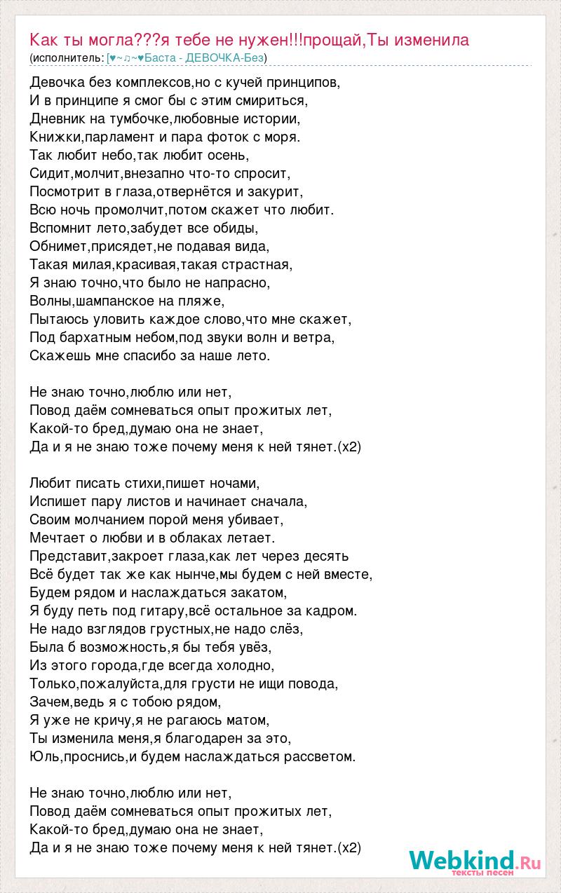 Девочка без комплексов,но с кучей принципов, И в принципе я смог бы с этим смириться, Дневник на тумбочке,любовные истории, Книжки,парламент и пара фоток с моря. Так любит небо,так любит осень, Сидит,молчит,внезапно что-то спросит, Посмотрит в глаза,отвернётся и закурит, Всю ночь промолчит,потом скажет что любит. Вспомнит лето,забудет все обиды, Обнимет,присядет,не подавая вида, Такая милая,красивая,такая страстная, Я знаю точно,что было не напрасно, Волны,шампанское на пляже, Пытаюсь уловить каждое слово,что мне скажет, Под бархатным небом,под звуки волн и ветра, Скажешь мне спасибо за наше лето. Не знаю точно,люблю или нет, Повод даём сомневаться опыт прожитых лет, Какой-то бред,думаю она не знает, Да и я не знаю тоже почему меня к ней тянет.(х2) Любит писать стихи,пишет ночами, Испишет пару листов и начинает сначала, Своим молчанием порой меня убивает, Мечтает о любви и в облаках летает. Представит,закроет глаза,как лет через десять Всё будет так же как нынче,мы будем с ней вместе, Будем рядом и наслаждаться закатом, Я буду петь под гитару,всё остальное за кадром. Не надо взглядов грустных,не надо слёз, Была б возможность,я бы тебя увёз, Из этого города,где всегда холодно, Только,пожалуйста,для грусти не ищи повода, Зачем,ведь я с тобою рядом, Я уже не кричу,я не рагаюсь матом, Ты изменила меня,я благодарен за это, Юль,проснись,и будем наслаждаться рассветом. Не знаю точно,люблю или нет, Повод даём сомневаться опыт прожитых лет, Какой-то бред,думаю она не знает, Да и я не знаю тоже почему меня к ней тянет.(х2)