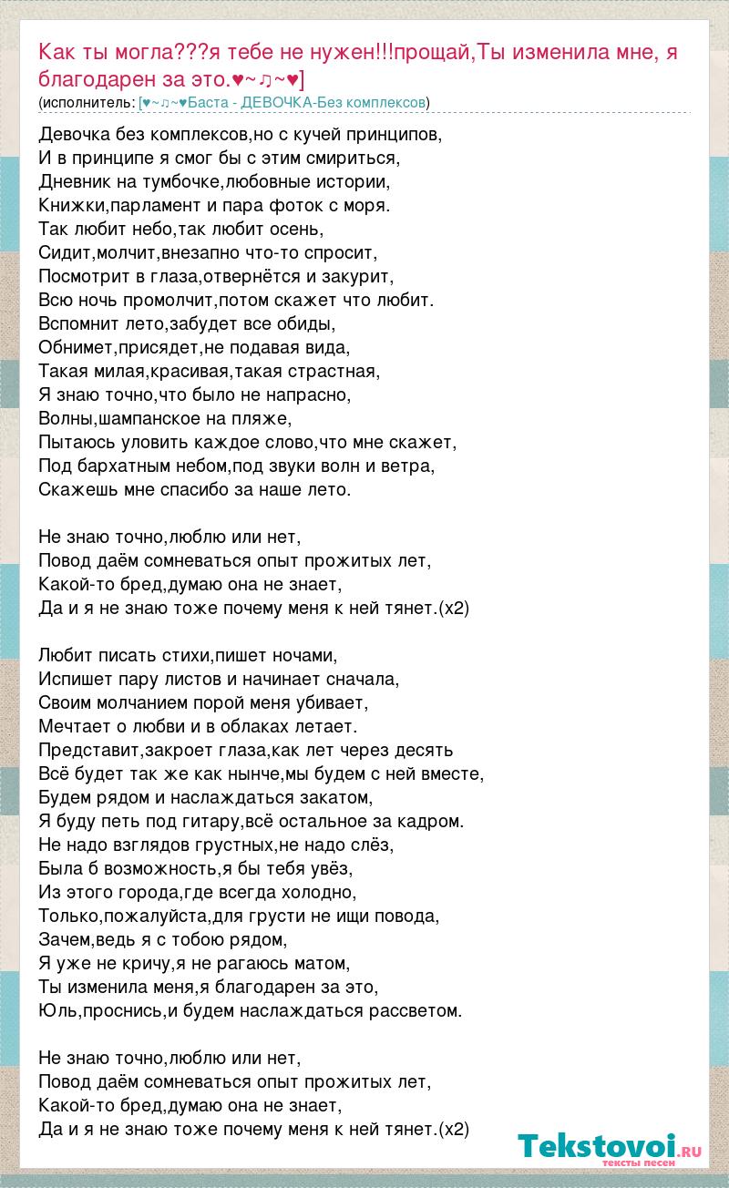 Главная→Исполнители→[♥~♫~♥Баста - ДЕВОЧКА-Без комплексов→Как ты могла???я тебе не нужен!!!прощай,Ты изменила мне, я благодарен за