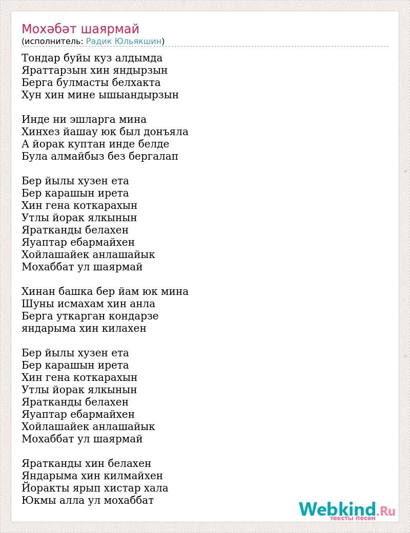 Тондар буйы куз алдымда Яраттарзын хин яндырзын Берга булмасты белхакта Хун хин мине ышыандырзын Инде ни эшларга мина Хинхез йашау юк был донъяла А йорак куптан инде белде Була алмайбыз без бергалап Бер йылы хузен ета Бер карашын ирета Хин гена коткарахын Утлы йорак ялкынын Яратканды белахен Яуаптар ебармайхен Хойлашайек анлашайык Мохаббат ул шаярмай Хинан башка бер йам юк мина Шуны исмахам хин анла Берга уткарган кондарзе яндарыма хин килахен Бер йылы хузен ета Бер карашын ирета Хин гена коткарахын Утлы йорак ялкынын Яратканды белахен Яуаптар ебармайхен Хойлашайек анлашайык Мохаббат ул шаярмай Яратканды хин белахен Яндарыма хин килмайхен Йоракты ярып хистар хала Юкмы алла ул мохаббат