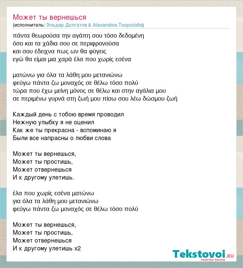 πάντα θεωρούσα την αγάπη σου τόσο δεδομένη όσο και τα χάδια σου σε περιφρονούσα και σου έδειχνα πως ων θα φύγεις εγώ θα είμαι μια χαρά έλα που χωρίς εσένα ματώνω για όλα τα λάθη μου μετανιώνω φεύγω πάντα ζω μοναχός σε θέλω τόσο πολύ τώρα που έχω μείνη μόνος σε θέλω και στην αγάλια μου σε περιμένω γυρνά στη ζωή μου πίσω σου λέω δώσμου ζωή Каждый день с тобою время проводил Нежную улыбку я не оценил Как же ты прекрасна - вспоминаю я Были все напрасны о любви слова Может ты вернешься, Может ты простишь, Может отвернешься И к другому улетишь. έλα που χωρίς εσένα ματώνω για όλα τα λάθη μου μετανιώνω φεύγω πάντα ζω μοναχός σε θέλω τόσο πολύ Может ты вернешься, Может ты простишь, Может отвернешься И к другому улетишь x2