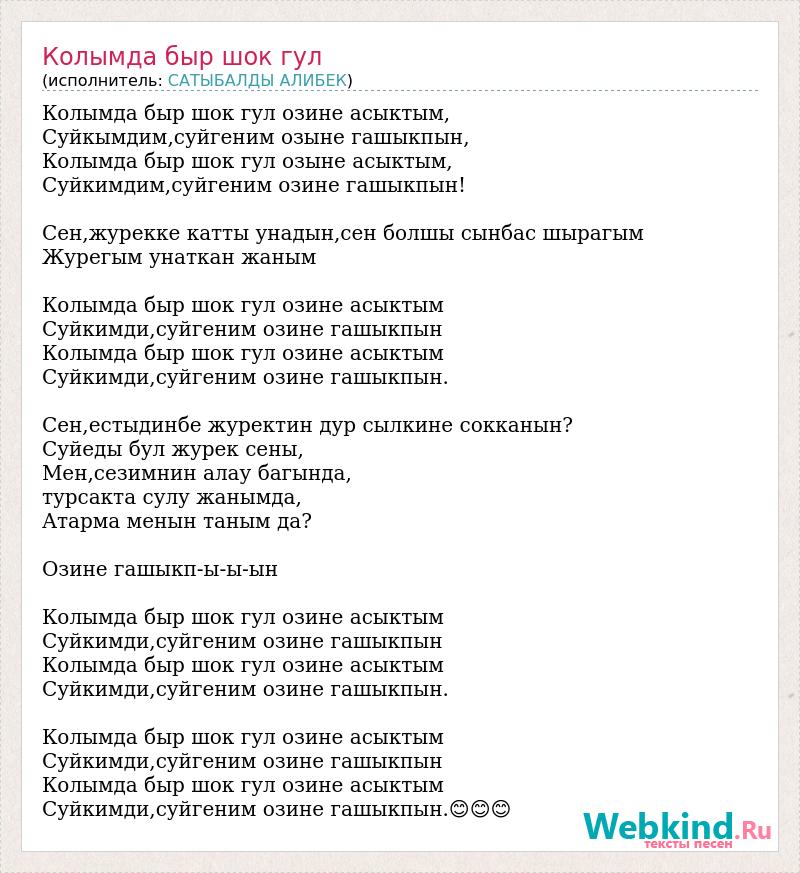 Колымда быр шок гул озине асыктым, Суйкымдим,суйгеним озыне гашыкпын, Колымда быр шок гул озыне асыктым, Суйкимдим,суйгеним озине гашыкпын! Сен,журекке катты унадын,сен болшы сынбас шырагым Журегым унаткан жаным Колымда быр шок гул озине асыктым Суйкимди,суйгеним озине гашыкпын Колымда быр шок гул озине асыктым Суйкимди,суйгеним озине гашыкпын. Сен,естыдинбе журектин дур сылкине сокканын? Суйеды бул журек сены, Мен,сезимнин алау багында, турсакта сулу жанымда, Атарма менын таным да? Озине гашыкп-ы-ы-ын Колымда быр шок гул озине асыктым Суйкимди,суйгеним озине гашыкпын Колымда быр шок гул озине асыктым Суйкимди,суйгеним озине гашыкпын. Колымда быр шок гул озине асыктым Суйкимди,суйгеним озине гашыкпын Колымда быр шок гул озине асыктым Суйкимди,суйгеним озине гашыкпын.😊😊😊💟