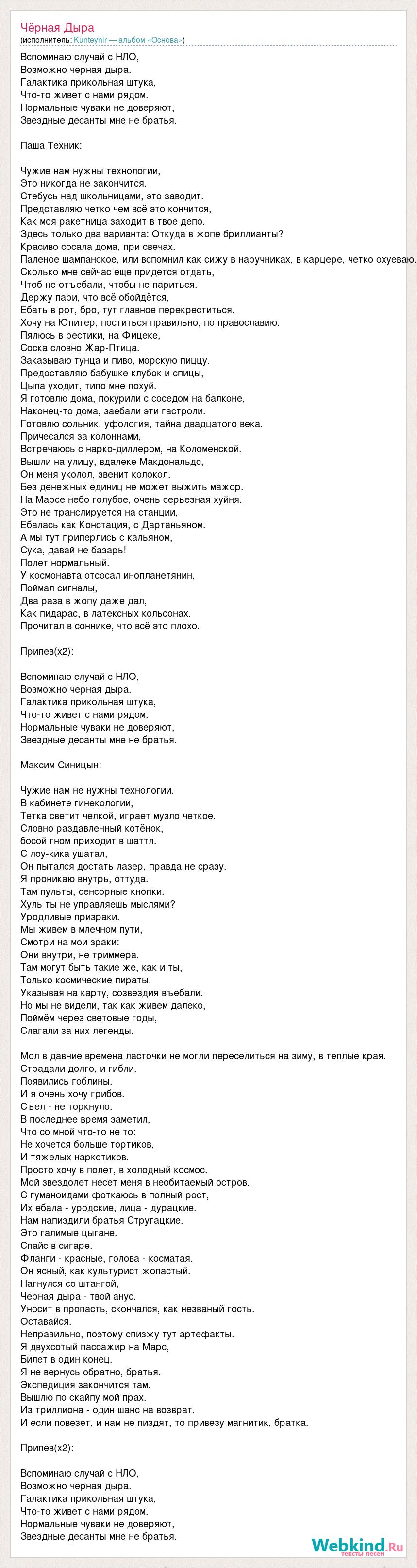 Вспоминаю случай с НЛО, Возможно черная дыра. Галактика прикольная штука, Что-то живет с нами рядом. Нормальные чуваки не доверяют, Звездные десанты мне не братья. Паша Техник: Чужие нам нужны технологии, Это никогда не закончится. Стебусь над школьницами, это заводит. Представляю четко чем всё это кончится, Как моя ракетница заходит в твое депо. Здесь только два варианта: Откуда в жопе бриллианты? Красиво сосала дома, при свечах. Паленое шампанское, или вспомнил как сижу в наручниках, в карцере, четко охуеваю. Сколько мне сейчас еще придется отдать, Чтоб не отъебали, чтобы не париться. Держу пари, что всё обойдётся, Ебать в рот, бро, тут главное перекреститься. Хочу на Юпитер, поститься правильно, по православию. Пялюсь в рестики, на Фицеке, Соска словно Жар-Птица. Заказываю тунца и пиво, морскую пиццу. Предоставляю бабушке клубок и спицы, Цыпа уходит, типо мне похуй. Я готовлю дома, покурили с соседом на балконе, Наконец-то дома, заебали эти гастроли. Готовлю сольник, уфология, тайна двадцатого века. Причесался за колоннами, Встречаюсь с нарко-диллером, на Коломенской. Вышли на улицу, вдалеке Макдональдс, Он меня уколол, звенит колокол. Без денежных единиц не может выжить мажор. На Марсе небо голубое, очень серьезная хуйня. Это не транслируется на станции, Ебалась как Констация, с Дартаньяном. А мы тут приперлись с кальяном, Сука, давай не базарь! Полет нормальный. У космонавта отсосал инопланетянин, Поймал сигналы, Два раза в жопу даже дал, Как пидарас, в латексных кольсонах. Прочитал в соннике, что всё это плохо. Припев(х2): Вспоминаю случай с НЛО, Возможно черная дыра. Галактика прикольная штука, Что-то живет с нами рядом. Нормальные чуваки не доверяют, Звездные десанты мне не братья. Максим Синицын: Чужие нам не нужны технологии. В кабинете гинекологии, Тетка светит челкой, играет музло четкое. Словно раздавленный котёнок, босой гном приходит в шаттл. С лоу-кика ушатал, Он пытался достать лазер, правда не сразу. Я проникаю внутрь, оттуда. Там пульты, сенсорные кнопки. Хуль ты не управляешь мыслями? Уродливые призраки. Мы живем в млечном пути, Смотри на мои зраки: Они внутри, не триммера. Там могут быть такие же, как и ты, Только космические пираты. Указывая на карту, созвездия въебали. Но мы не видели, так как живем далеко, Поймём через световые годы, Слагали за них легенды. Мол в давние времена ласточки не могли переселиться на зиму, в теплые края. Страдали долго, и гибли. Появились гоблины. И я очень хочу грибов. Съел - не торкнуло. В последнее время заметил, Что со мной что-то не то: Не хочется больше тортиков, И тяжелых наркотиков. Просто хочу в полет, в холодный космос. Мой звездолет несет меня в необитаемый остров. С гуманоидами фоткаюсь в полный рост, Их ебала - уродские, лица - дурацкие. Нам напиздили братья Стругацкие. Это галимые цыгане. Спайс в сигаре. Фланги - красные, голова - косматая. Он ясный, как культурист жопастый. Нагнулся со штангой, Черная дыра - твой анус. Уносит в пропасть, скончался, как незваный гость. Оставайся. Неправильно, поэтому спизжу тут артефакты. Я двухсотый пассажир на Марс, Билет в один конец. Я не вернусь обратно, братья. Экспедиция закончится там. Вышлю по скайпу мой прах. Из триллиона - один шанс на возврат. И если повезет, и нам не пиздят, то привезу магнитик, братка. Припев(х2): Вспоминаю случай с НЛО, Возможно черная дыра. Галактика 