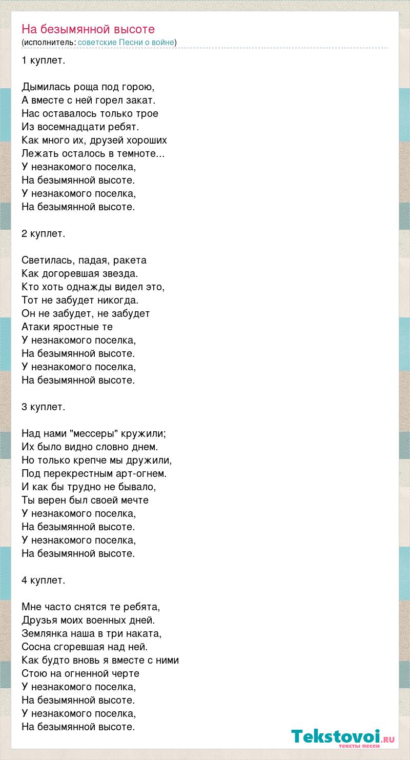 1 куплет. Дымилась роща под горою, А вместе с ней горел закат. Нас оставалось только трое Из восемнадцати ребят. Как много их, друзей хороших Лежать осталось в темноте... У незнакомого поселка, На безымянной высоте. У незнакомого поселка, На безымянной высоте. 2 куплет. Светилась, падая, ракета Как догоревшая звезда. Кто хоть однажды видел это, Тот не забудет никогда. Он не забудет, не забудет Атаки яростные те У незнакомого поселка, На безымянной высоте. У незнакомого поселка, На безымянной высоте. 3 куплет. Над нами "мессеры" кружили; Их было видно словно днем. Но только крепче мы дружили, Под перекрестным арт-огнем. И как бы трудно не бывало, Ты верен был своей мечте У незнакомого поселка, На безымянной высоте. У незнакомого поселка, На безымянной высоте. 4 куплет. Мне часто снятся те ребята, Друзья моих военных дней. Землянка наша в три наката, Сосна сгоревшая над ней. Как будто вновь я вместе с ними Стою на огненной черте У незнакомого поселка, На безымянной высоте. У незнакомого поселка, На безымянной высоте.