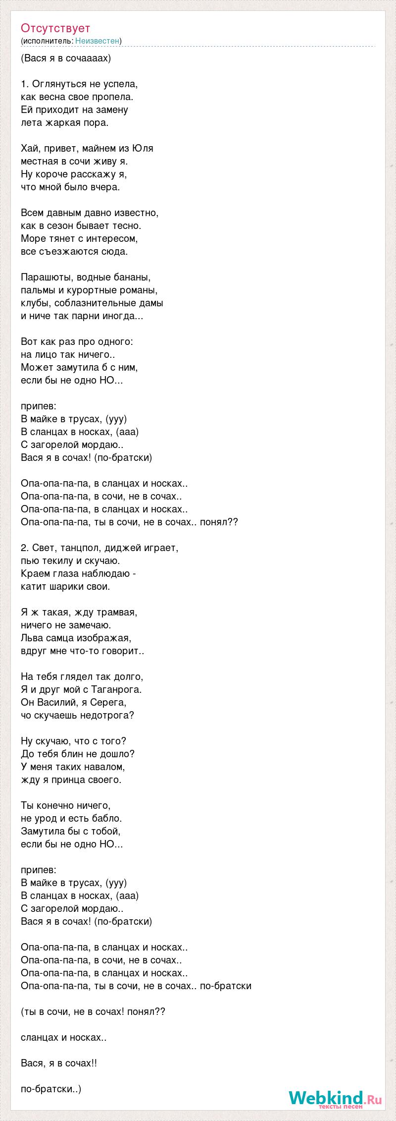 (Вася я в сочаааах) 1. Оглянуться не успела, как весна свое пропела. Ей приходит на замену лета жаркая пора. Хай, привет, майнем из Юля местная в сочи живу я. Ну короче расскажу я, что мной было вчера. Всем давным давно известно, как в сезон бывает тесно. Море тянет с интересом, все съезжаются сюда. Парашюты, водные бананы, пальмы и курортные романы, клубы, соблазнительные дамы и ниче так парни иногда... Вот как раз про одного: на лицо так ничего.. Может замутила б с ним, если бы не одно НО... припев: В майке в трусах, (ууу) В сланцах в носках, (ааа) С загорелой мордаю.. Вася я в сочах! (по-братски) Опа-опа-па-па, в сланцах и носках.. Опа-опа-па-па, в сочи, не в сочах.. Опа-опа-па-па, в сланцах и носках.. Опа-опа-па-па, ты в сочи, не в сочах.. понял?? 2. Свет, танцпол, диджей играет, пью текилу и скучаю. Краем глаза наблюдаю - катит шарики свои. Я ж такая, жду трамвая, ничего не замечаю. Льва самца изображая, вдруг мне что-то говорит.. На тебя глядел так долго, Я и друг мой с Таганрога. Он Василий, я Серега, чо скучаешь недотрога? Ну скучаю, что с того? До тебя блин не дошло? У меня таких навалом, жду я принца своего. Ты конечно ничего, не урод и есть бабло. Замутила бы с тобой, если бы не одно НО... припев: В майке в трусах, (ууу) В сланцах в носках, (ааа) С загорелой мордаю.. Вася я в сочах! (по-братски) Опа-опа-па-па, в сланцах и носках.. Опа-опа-па-па, в сочи, не в сочах.. Опа-опа-па-па, в сланцах и носках.. Опа-опа-па-па, ты в сочи, не в сочах.. по-братски (ты в сочи, не в сочах! понял?? сланцах и носках.. Вася, я в сочах!! по-братски..)