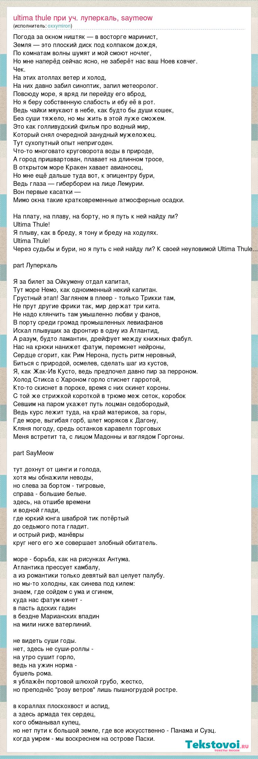 Погода за окном ништяк — в восторге маринист, Земля — это плоский диск под колпаком дождя, По комнатам волны шумят и мой смоют ночлег, Но мне наперёд сейчас ясно, не заберёт нас ваш Ноев ковчег. Чек. На этих атоллах ветер и холод, На них давно забил синоптик, запил метеоролог. Повсюду море, я вряд ли перейду его вброд, Но я беру собственную слабость и ебу её в рот. Ведь чайки мяукают в небе, как будто бы души кошек, Без суши тяжело, но мы жить в этой луже сможем. Это как голливудский фильм про водный мир, Который снял очередной занудный мужеложец. Тут сухопутный опыт непригоден. Что-то многовато круговорота воды в природе, А город пришвартован, плавает на длинном тросе, В открытом море Кракен хавает авианосец, Но мне ещё дальше туда вот, к эпицентру бури, Ведь глаза — гибербореи на лице Лемурии. Вон первые касатки — Мимо окна такие кратковременные атмосферные осадки. На плату, на плаву, на борту, но я путь к ней найду ли? Ultima Thule! Я плыву, как в бреду, я тону и бреду на ходулях. Ultima Thule! Через судьбы и бури, но я путь с ней найду ли? К своей неуловимой Ultima Thule... part Луперкаль Я за билет за Ойкумену отдал капитал, Тут море Немо, как одноименный некий капитан. Грустный этап! Заглянем в плеер - только Трикки там, Не прут другие фрики так, мир держат три кита. Не надо клянчить там умышленно любви у фанов, В порту среди громад промышленных левиафанов Искал плывущих за фронтир в одну из Атлантид, А разум, будто ламантин, дрейфует между книжных фабул. Нас на крюки нанижет фатум, перемкнет нейроны, Сердце сгорит, как Рим Нерона, пусть ритм неровный, Биться с природой, осмелев, сделать шаг из кустов, Я, как Жак-Ив Кусто, ведь предпочел давно пир за перроном. Холод Стикса с Хароном горло стиснет гарротой, Кто-то скиснет в пороке, время с них скинет короны. С той же стрижкой короткой в трюме меж сеток, коробок Севшим на паром укажет путь лоцман седобородый, Ведь курс лежит туда, на край материков, за горы, Где море, выгибая горб, шлет моряков к Дагону, Кляня погоду, средь останков каравелл торговых Меня встретит та, с лицом Мадонны и взглядом Горгоны. part SayMeow тут дохнут от цинги и голода, хотя мы обнажили неводы, но слева за бортом - тигровые, справа - большие белые. здесь, на отшибе времени и водной глади, где юркий юнга шваброй тик потёртый до седьмого пота гладит. и острый риф, манёвры круг него его же совершает злобный обитатель. море - борьба, как на рисунках Антума. Атлантика прессует камбалу, а из романтики только девятый вал целует палубу. но мы-то холодны, как синева под килем: знаем, где сойдем с ума и сгинем, куда нас фатум кинет - в пасть адских гадин в бездне Марианских впадин на мили ниже ватерлиний. не видеть суши годы. нет, здесь не суши-роллы - на утро сушит горло, ведь на ужин норма - бушель рома. я ублажён портовой шлюхой грубо, жестко, но преподнёс "розу ветров" лишь пышногрудой ростре. в кораллах плоскохвост и аспид, а здесь армада тех сердец, кого обманывал купец, но нет пути к большой земле, где все искусственно - Панама и Суэц. когда умрем - мы воскреснем на острове Пасхи.