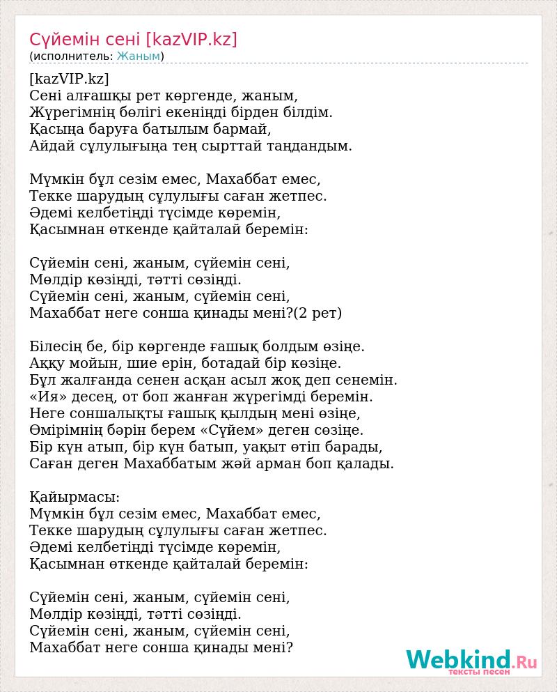 [kazVIP.kz] Сені алғашқы рет көргенде, жаным, Жүрегімнің бөлігі екеніңді бірден білдім. Қасыңа баруға батылым бармай, Айдай сұлулығыңа тең сырттай таңдандым. Мүмкін бұл сезім емес, Махаббат емес, Текке шарудың сұлулығы саған жетпес. Әдемі келбетіңді түсімде көремін, Қасымнан өткенде қайталай беремін: Сүйемін сені, жаным, сүйемін сені, Мөлдір көзіңді, тәтті сөзіңді. Сүйемін сені, жаным, сүйемін сені, Махаббат неге сонша қинады мені?(2 рет) Білесің бе, бір көргенде ғашық болдым өзіңе. Аққу мойын, шие ерін, ботадай бір көзіңе. Бұл жалғанда сенен асқан асыл жоқ деп сенемін. «Ия» десең, от боп жанған жүрегімді беремін. Неге соншалықты ғашық қылдың мені өзіңе, Өмірімнің бәрін берем «Сүйем» деген сөзіңе. Бір күн атып, бір күн батып, уақыт өтіп барады, Саған деген Махаббатым жәй арман боп қалады. Қайырмасы: Мүмкін бұл сезім емес, Махаббат емес, Текке шарудың сұлулығы саған жетпес. Әдемі келбетіңді түсімде көремін, Қасымнан өткенде қайталай беремін: Сүйемін сені, жаным, сүйемін сені, Мөлдір көзіңді, тәтті сөзіңді. Сүйемін сені, жаным, сүйемін сені, Махаббат неге сонша қинады мені?