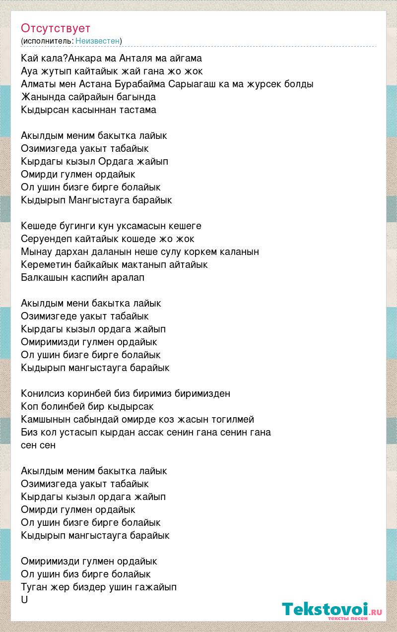 Кай кала?Анкара ма Анталя ма айгама Ауа жутып кайтайык жай гана жо жок Алматы мен Астана Бурабайма Сарыагаш ка ма журсек болды Жанында сайрайын багында Кыдырсан касыннан тастама Акылдым меним бакытка лайык Озимизгеда уакыт табайык Кырдагы кызыл Ордага жайып Омирди гулмен ордайык Ол ушин бизге бирге болайык Кыдырып Мангыстауга барайык Кешеде бугинги кун уксамасын кешеге Серуендеп кайтайык кошеде жо жок Мынау дархан даланын неше сулу коркем каланын Кереметин байкайык мактанып айтайык Балкашын каспийн аралап Акылдым мени бакытка лайык Озимизгеде уакыт табайык Кырдагы кызыл ордага жайып Омиримизди гулмен ордайык Ол ушин бизге бирге болайык Кыдырып мангыстауга барайык Конилсиз коринбей биз биримиз биримизден Коп болинбей бир кыдырсак Камшынын сабындай омирде коз жасын тогилмей Биз кол устасып кырдан ассак сенин гана сенин гана сен сен Акылдым меним бакытка лайык Озимизгеда уакыт табайык Кырдагы кызыл ордага жайып Омирди гулмен ордайык Ол ушин бизге бирге болайык Кыдырып мангыстауга барайык Омиримизди гулмен ордайык Ол ушин биз бирге болайык Туган жер биздер ушин гажайып U