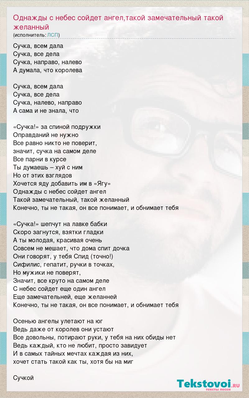 Сучка, всем дала Сучка, все дела Сучка, направо, налево А думала, что королева Сучка, всем дала Сучка, все дела Сучка, налево, направо А сама и не знала, что «Сучка!» за спиной подружки Оправданий не нужно Все равно никто не поверит, значит, сучка на самом деле Все парни в курсе Ты думаешь – хуй с ним Но от этих взглядов Хочется яду добавить им в «Ягу» Однажды с небес сойдет ангел Такой замечательный, такой желанный Конечно, ты не такая, он все понимает, и обнимает тебя «Сучка!» шепчут на лавке бабки Скоро загнутся, взятки гладки А ты молодая, красивая очень Совсем не мешает, что дома спит дочка Они говорят, у тебя Спид (точно!) Сифилис, гепатит, ручки в точках, Но мужики не поверят, Значит, все круто на самом деле С небес сойдет еще один ангел Еще замечательней, еще желанней Конечно, ты не такая, он все понимает, и обнимает тебя Осенью ангелы улетают на юг Ведь даже от королев они устают Все довольны, потирают руки, у тебя на них обиды нет Ведь каждый, кто не любит, просто завидует И в самых тайных мечтах каждая из них, хочет стать такой как ты, хотя бы на миг Сучкой