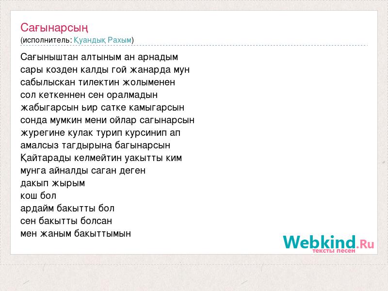 Сағыныштан алтыным ан арнадым сары козден калды гой жанарда мун сабылыскан тилектин жолыменен сол кеткеннен сен оралмадын жабыгарсын ьир сатке камыгарсын сонда мумкин мени ойлар сагынарсын журегине кулак турип курсинип ап амалсыз тагдырына багынарсын Қайтарады келмейтин уакытты ким мунга айналды саган деген дакып жырым кош бол ардайм бакытты бол сен бакытты болсан мен жаным бакыттымын