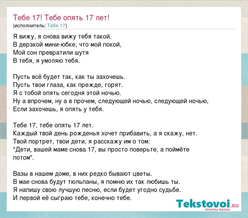 Я вижу, я снова вижу тебя такой. В дерзкой мини-юбке, что мой покой, Мой сон превратили шутя В тебя, я умоляю тебя. Пусть всё будет так, как ты захочешь. Пусть твои глаза, как прежде, горят. Я с тобой опять сегодня этой ночью. Ну а впрочем, ну а в прочем, следующей ночью, следующей ночью, Если захочешь, я опять у тебя. Тебе 17, тебе опять 17 лет. Каждый твой день рожденья хочет прибавить, а я скажу, нет. Твой портрет, твои дети, я расскажу им о том: "Дети, вашей маме снова 17, вы просто поверьте, а поймёте потом". Вазы в нашем доме, в них редко бывают цветы. В мае снова будут тюльпаны, я помню их так любишь ты. Я напишу свою лучшую песню, если будет угодно судьбе. И первой её сыграю тебе, конечно тебе.