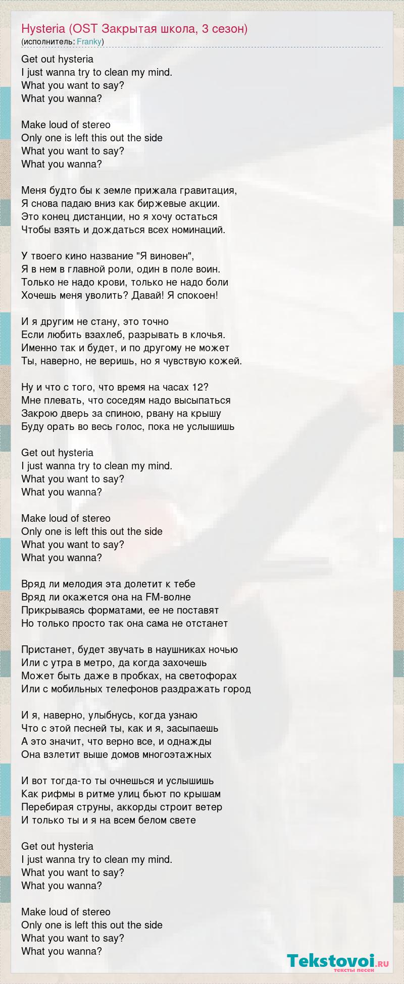 Get out hysteria I just wanna try to clean my mind. What you want to say? What you wanna? Make loud of stereo Only one is left this out the side What you want to say? What you wanna? Меня будто бы к земле прижала гравитация, Я снова падаю вниз как биржевые акции. Это конец дистанции, но я хочу остаться Чтобы взять и дождаться всех номинаций. У твоего кино название "Я виновен", Я в нем в главной роли, один в поле воин. Только не надо крови, только не надо боли Хочешь меня уволить? Давай! Я спокоен! И я другим не стану, это точно Если любить взахлеб, разрывать в клочья. Именно так и будет, и по другому не может Ты, наверно, не веришь, но я чувствую кожей. Ну и что с того, что время на часах 12? Мне плевать, что соседям надо высыпаться Закрою дверь за спиною, рвану на крышу Буду орать во весь голос, пока не услышишь Get out hysteria I just wanna try to clean my mind. What you want to say? What you wanna? Make loud of stereo Only one is left this out the side What you want to say? What you wanna? Вряд ли мелодия эта долетит к тебе Вряд ли окажется она на FM-волне Прикрываясь форматами, ее не поставят Но только просто так она сама не отстанет Пристанет, будет звучать в наушниках ночью Или с утра в метро, да когда захочешь Может быть даже в пробках, на светофорах Или с мобильных телефонов раздражать город И я, наверно, улыбнусь, когда узнаю Что с этой песней ты, как и я, засыпаешь А это значит, что верно все, и однажды Она взлетит выше домов многоэтажных И вот тогда-то ты очнешься и услышишь Как рифмы в ритме улиц бьют по крышам Перебирая струны, аккорды строит ветер И только ты и я на всем белом свете Get out hysteria I just wanna try to clean my mind. What you want to say? What you wanna? Make loud of stereo Only one is left this out the side What you want to say? What you wanna?
