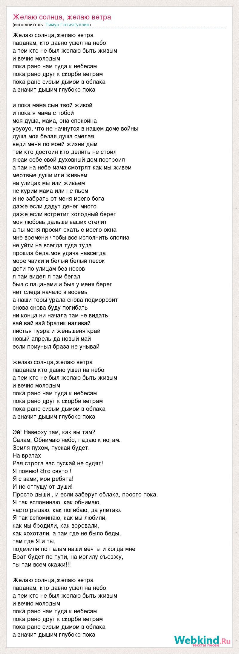 Желаю солнца,желаю ветра пацанам, кто давно ушел на небо а тем кто не был желаю быть живым и вечно молодым пока рано нам туда к небесам пока рано друг к скорби ветрам пока рано сизым дымом в облака а значит дышим глубоко пока и пока мама сын твой живой и пока я мама с тобой моя душа, мама, она спокойна уоуоуо, что не начнутся в нашем доме войны душа моя белая душа смелая веди меня по моей жизни дым тем кто достоин кто делить не стоил я сам себе свой духовный дом построил а там на небе мама смотрят как мы живем мертвые души или живьем на улицах мы или живьем не курим мама или не пьем и не забрать от меня моего бога даже если дадут денег много даже если встретит холодный берег моя любовь дальше ваших стелит а ты меня просил ехать с моего окна мне времени чтобы все исполнить сполна не уйти на всегда туда туда прошла беда.моя удача навсегда море чайки и белый белый песок дети по улицам без носов я там видел я там бегал был с пацанами и был у меня берег нет следа начало в восемь а наши горы урала снова подморозит снова снова буду погибать ни конца ни начала там не видать вай вай вай братик наливай листья пуэра и женьшеня край новый апрель да новый май если приуныл браза не унывай желаю солнца,желаю ветра пацанам кто давно ушел на небо а тем кто не был желаю быть живым и вечно молодым пока рано нам туда к небесам пока рано друг к скорби ветрам пока рано сизым дымом в облака а значит дышим глубоко пока Эй! Наверху там, как вы там? Салам. Обнимаю небо, падаю к ногам. Земля пухом, пускай будет. На вратах Рая строга вас пускай не судят! Я помню! Это свято ! Я с вами, мои ребята! И не отпущу от души! Просто дыши , и если заберут облака, просто пока. Я так вспоминаю, как обнимаю, часто рыдаю, как погибаю, да улетаю. Я так вспоминаю, как мы любили, как мы бродили, как воровали, как хохотали, а там где не было беды, там где Я и ты, поделили по палам наши мечты и когда мне Брат будет по пути, на могилу съезжу, ты там всем скажи!!! Желаю солнца,желаю ветра пацанам, кто давно ушел на небо а тем кто не был желаю быть живым и вечно молодым пока рано нам туда к небесам пока рано друг к скорби ветрам пока рано сизым дымом в облака а значит дышим глубоко пока