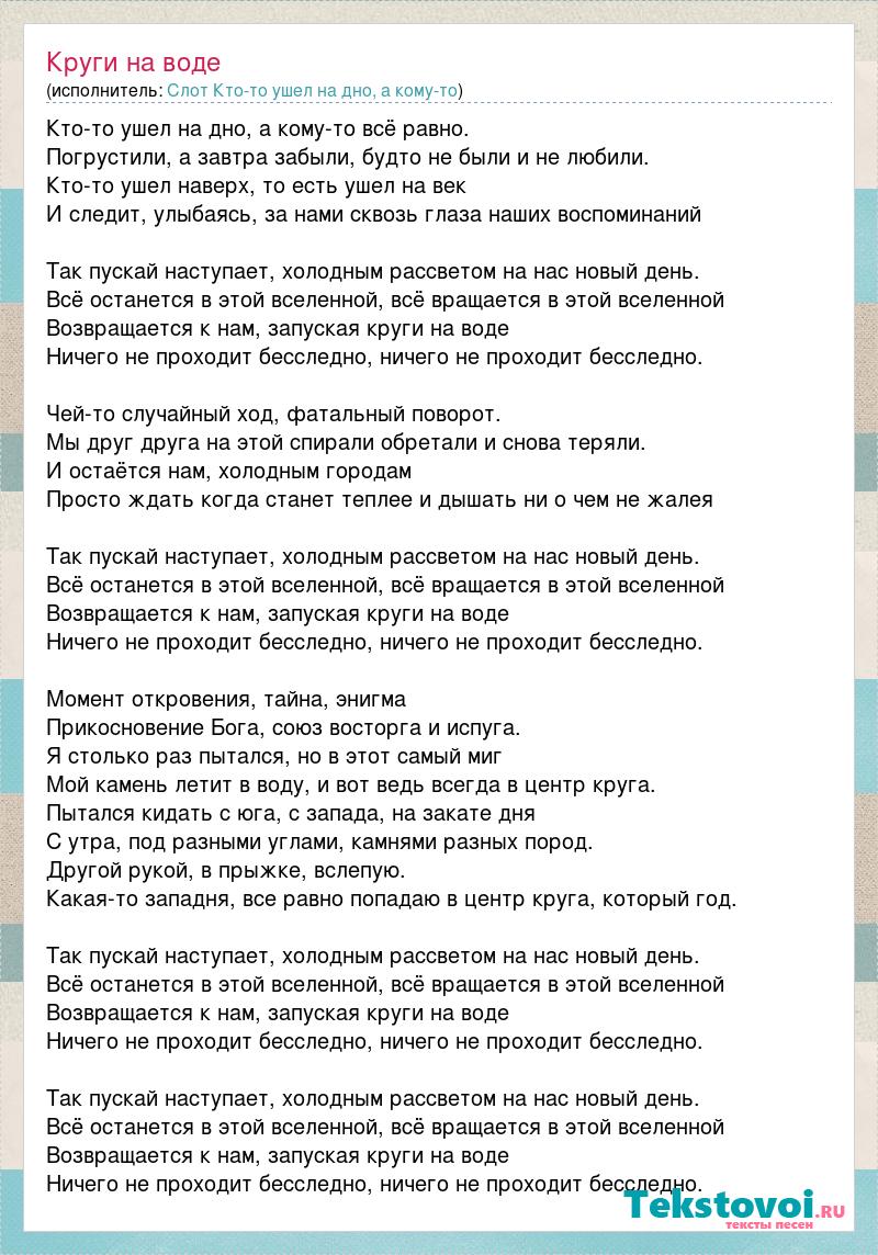 Кто-то ушел на дно, а кому-то всё равно. Погрустили, а завтра забыли, будто не были и не любили. Кто-то ушел наверх, то есть ушел на век И следит, улыбаясь, за нами сквозь глаза наших воспоминаний Так пускай наступает, холодным рассветом на нас новый день. Всё останется в этой вселенной, всё вращается в этой вселенной Возвращается к нам, запуская круги на воде Ничего не проходит бесследно, ничего не проходит бесследно. Чей-то случайный ход, фатальный поворот. Мы друг друга на этой спирали обретали и снова теряли. И остаётся нам, холодным городам Просто ждать когда станет теплее и дышать ни о чем не жалея Так пускай наступает, холодным рассветом на нас новый день. Всё останется в этой вселенной, всё вращается в этой вселенной Возвращается к нам, запуская круги на воде Ничего не проходит бесследно, ничего не проходит бесследно. Момент откровения, тайна, энигма Прикосновение Бога, союз восторга и испуга. Я столько раз пытался, но в этот самый миг Мой камень летит в воду, и вот ведь всегда в центр круга. Пытался кидать с юга, с запада, на закате дня С утра, под разными углами, камнями разных пород. Другой рукой, в прыжке, вслепую. Какая-то западня, все равно попадаю в центр круга, который год. Так пускай наступает, холодным рассветом на нас новый день. Всё останется в этой вселенной, всё вращается в этой вселенной Возвращается к нам, запуская круги на воде Ничего не проходит бесследно, ничего не проходит бесследно. Так пускай наступает, холодным рассветом на нас новый день. Всё останется в этой вселенной, всё вращается в этой вселенной Возвращается к нам, запуская круги на воде Ничего не проходит бесследно, ничего не проходит бесследно.