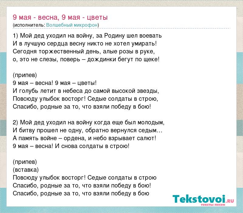 1) Мой дед уходил на войну, за Родину шел воевать И в лучшую сердца весну никто не хотел умирать! Сегодня торжественный день, алые розы в руке, о, это не слезы, поверь – дождинки бегут по щеке! (припев) 9 мая – весна! 9 мая – цветы! И голубь летит в небеса до самой высокой звезды, Повсюду улыбок восторг! Седые солдаты в строю, Спасибо, родные за то, что взяли победу в бою! 2) Мой дед уходил на войну когда еще был молодым, И битву прошел не одну, обратно вернулся седым… А память войне – ордена, и небо взрывает салют! 9 мая – весна! И снова солдаты в строю! (припев) (вставка) Повсюду улыбок восторг! Седые солдаты в строю Спасибо, родные за то, что взяли победу в бою! Спасибо, родные за то, что взяли победу в бою