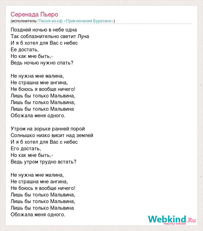 Поздней ночью в небе одна Так соблазнительно светит Луна И я б хотел для Вас с небес Ее достать, Но как мне быть,- Ведь ночью нужно спать? Не нужна мне малина, Не страшна мне ангина, Не боюсь я вообще ничего! Лишь бы только Мальвина, Лишь бы только Мальвина, Лишь бы только Мальвина Обожала меня одного. Утром на зорьке ранней порой Солнышко низко висит над землей И я б хотел для Вас с небес Его достать, Но как мне быть,- Ведь утром трудно встать? Не нужна мне малина, Не страшна мне ангина, Не боюсь я вообще ничего! Лишь бы только Мальвина, Лишь бы только Мальвина, Лишь бы только Мальвина Обожала меня одного.