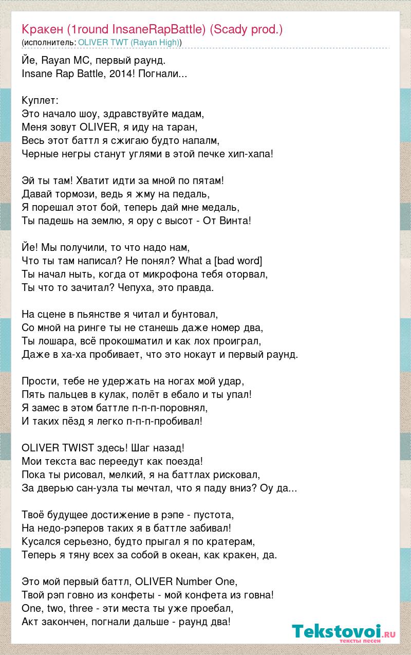 Йе, Rayan MC, первый раунд. Insane Rap Battle, 2014! Погнали... Куплет: Это начало шоу, здравствуйте мадам, Меня зовут OLIVER, я иду на таран, Весь этот баттл я сжигаю будто напалм, Черные негры станут углями в этой печке хип-хапа! Эй ты там! Хватит идти за мной по пятам! Давай тормози, ведь я жму на педаль, Я порешал этот бой, теперь дай мне медаль, Ты падешь на землю, я ору с высот - От Винта! Йе! Мы получили, то что надо нам, Что ты там написал? Не понял? What a [bad word] Ты начал ныть, когда от микрофона тебя оторвал, Ты что то зачитал? Чепуха, это правда. На сцене в пьянстве я читал и бунтовал, Со мной на ринге ты не станешь даже номер два, Ты лошара, всё прокошматил и как лох проиграл, Даже в ха-ха пробивает, что это нокаут и первый раунд. Прости, тебе не удержать на ногах мой удар, Пять пальцев в кулак, полёт в ебало и ты упал! Я замес в этом баттле п-п-п-поровнял, И таких пёзд я легко п-п-п-пробивал! OLIVER TWIST здесь! Шаг назад! Мои текста вас переедут как поезда! Пока ты рисовал, мелкий, я на баттлах рисковал, За дверью сан-узла ты мечтал, что я паду вниз? Оу да... Твоё будущее достижение в рэпе - пустота, На недо-рэперов таких я в баттле забивал! Кусался серьезно, будто прыгал я по кратерам, Теперь я тяну всех за собой в океан, как кракен, да. Это мой первый баттл, OLIVER Number One, Твой рэп говно из конфеты - мой конфета из говна! One, two, three - эти места ты уже проебал, Акт закончен, погнали дальше - раунд два!