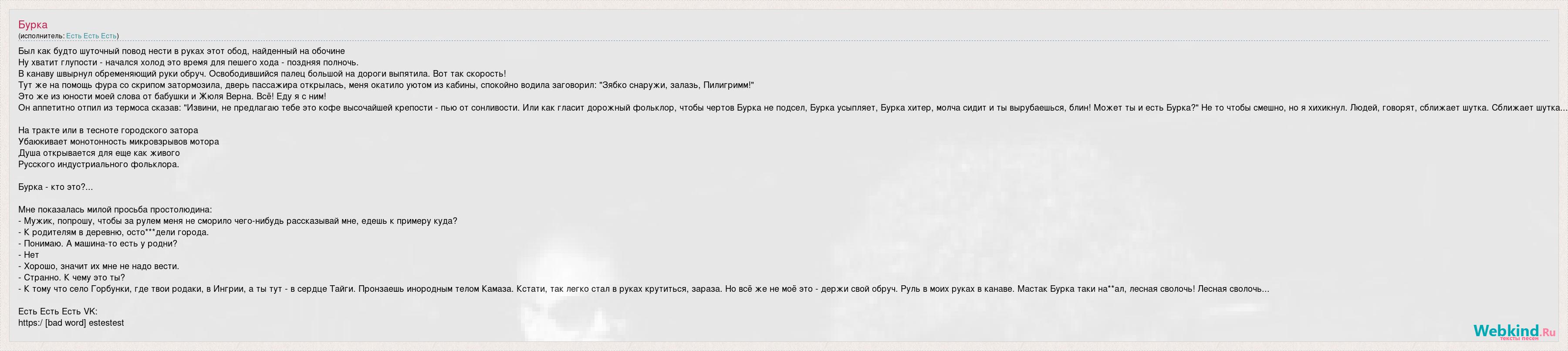 Был как будто шуточный повод нести в руках этот обод, найденный на обочине Ну хватит глупости - начался холод это время для пешего хода - поздняя полночь. В канаву швырнул обременяющий руки обруч. Освободившийся палец большой на дороги выпятила. Вот так скорость! Тут же на помощь фура со скрипом затормозила, дверь пассажира открылась, меня окатило уютом из кабины, спокойно водила заговорил: "Зябко снаружи, залазь, Пилигримм!" Это же из юности моей слова от бабушки и Жюля Верна. Всё! Еду я с ним! Он аппетитно отпил из термоса сказав: "Извини, не предлагаю тебе это кофе высочайшей крепости - пью от сонливости. Или как гласит дорожный фольклор, чтобы чертов Бурка не подсел, Бурка усыпляет, Бурка хитер, молча сидит и ты вырубаешься, блин! Может ты и есть Бурка?" Не то чтобы смешно, но я хихикнул. Людей, говорят, сближает шутка. Сближает шутка... На тракте или в тесноте городского затора Убаюкивает монотонность микровзрывов мотора Душа открывается для еще как живого Русского индустриального фольклора. Бурка - кто это?... Мне показалась милой просьба простолюдина: - Мужик, попрошу, чтобы за рулем меня не сморило чего-нибудь рассказывай мне, едешь к примеру куда? - К родителям в деревню, осто***дели города. - Понимаю. А машина-то есть у родни? - Нет - Хорошо, значит их мне не надо вести. - Странно. К чему это ты? - К тому что село Горбунки, где твои родаки, в Ингрии, а ты тут - в сердце Тайги. Пронзаешь инородным телом Камаза. Кстати, так легко стал в руках крутиться, зараза. Но всё же не моё это - держи свой обруч. Руль в моих руках в канаве. Мастак Бурка таки на**ал, лесная сволочь! Лесная сволочь... Есть Есть Есть VK: https:/ [bad word] estestest