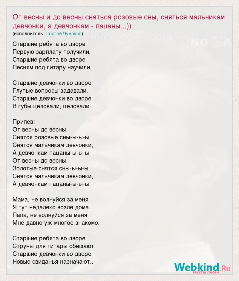 Старшие ребята во дворе Первую зарплату получили, Старшие ребята во дворе Песням под гитару научили. Старшие девчонки во дворе Глупые вопросы задавали, Старшие девчонки во дворе В губы целовали, целовали.. Припев: От весны до весны Снятся розовые сны-ы-ы-ы Снятся мальчикам девчонки, А девчонкам пацаны-ы-ы-ы От весны до весны Золотые снятся сны-ы-ы-ы Снятся мальчикам девчонки, А девчонкам пацаны-ы-ы-ы Мама, не волнуйся за меня Я тут недалеко возле дома. Папа, не волнуйся за меня Мне давно уж многое знакомо. Старшие ребята во дворе Струны для гитары обещают. Старшие девчонки во дворе Новые свиданья назначают..
