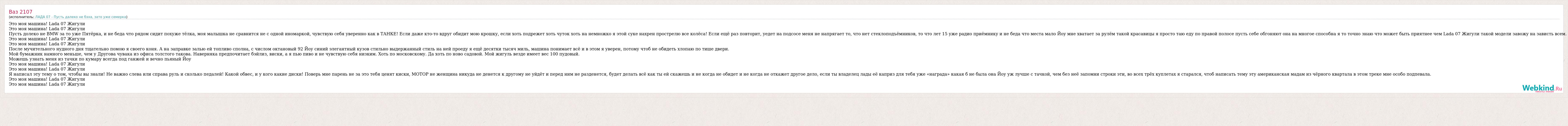 Это моя машина! Lada 07 Жигули Это моя машина! Lada 07 Жигули Пусть долеко не BMW за то уже Пятёрка, и не беда что рядом сидит похуже тёлка, моя малышка не сравнится не с одной иномаркой, чувствую себя уверенно как в ТАНКЕ! Если даже кто-то вдруг обидит мою крошку, если хоть подрежет хоть чуток хоть на немножко я этой суке нахрен прострелю все колёса! Если ещё раз повторит, уедет на подсосе меня не напрягает то, что нет стеклоподъёмников, то что лет 15 уже радио приёмнику и не беда что места мало Йоу мне хватает за рулём такой красавицы я просто таю еду по правой полосе пусть себе обгоняют она на многое способна я то точно знаю что может быть приятнее чем Lada 07 Жигули такой модели завожу на зависть всем. Это моя машина! Lada 07 Жигули Это моя машина! Lada 07 Жигули После мучительного нудного дня тщательно помою я своего коня. А на заправке залью ей топливо сполна, с числом октановый 92 Йоу синий элегантный кузов стильно выдержанный стиль на ней проеду я ещё десятки тысяч миль, машина понимает всё и в этом я уверен, потому чтоб не обидеть хлопаю по тише двери. Мой бумажник намного меньше, чем у Другова чувака из офиса толстого такова. Наверняка предпочитает бэйлиз, виски, а я пью пиво и не чувствую себя низким. Хоть по московскому. Да хоть по ново садовой. Мой жигуль везде имеет вес 100 пудовый. Можешь узнать меня из тачки по кумару всегда под ганжей и вечно пьяный Йоу Это моя машина! Lada 07 Жигули Это моя машина! Lada 07 Жигули Я написал эту тему о том, чтобы вы знали! Не важно слева или справа руль и сколько педалей! Какой обвес, и у кого какие диски! Поверь мне парень не за это тебя ценят киски, МОТОР не женщина никуда не денется к другому не уйдёт и перед ним не разденется, будет делать всё как ты ей скажешь и не когда не обидет и не когда не откажет другое дело, если ты владелец лады её каприз для тебя уже «награда» какая б не была она Йоу уж лучше с тачкой, чем без неё запомни строки эти, во всех трёх куплетах я старался, чтоб написать тему эту американская мадам из чёрного квартала в этом треке мне особо подпевала. Это моя машина! Lada 07 Жигули Это моя машина! Lada 07 Жигули