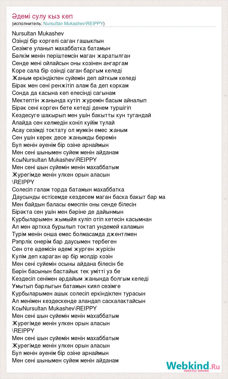 Nursultan Mukashev Озінді бір коргелі саган гашыкпын Сезімге уланып махаббатка батамын Бәлкім менін періштемсін маган жаратылган Сенде мені ойлайсын оны козінен ангаргам Коре сала бір озінді саган баргым келеді Жаным еркіндікпен суйемін деп айткым келеді Бірәк мен сені ренжітіп алам ба деп коркам Сонда да касына кеп елесінді сагынам Мектептін жанында кутіп журемін басым айналып Бірәк сені корген бете кетеді денем туршігіп Кездесуге шакырып мен ушін бакытты кун тугандай Алайда сен келмедін коніл куйім тулай Асау сезімді токтату ол мумкін емес жаным Сен ушін керек десе жанымды беремін Бул менін әуенім бір озіне арнаймын Мен сені шынымен суйем менін айданам КсыNursultan Mukashev\REIPPY Мен сені шын суйемін менін махаббатым Журегімде менін улкен орын аласын \REIPPY Солесіп галам торда батамын махаббатка Даусынды естісемде кездесем маган баска бакыт бар ма Мен байдын баласы емеспін оны сенде білесін Бірәкта сен ушін мен бәріне де дайынмын Курбыларымен жымыйя куліп отіп кетесін касымнан Ал мен арткка бурылып токтап ундемей каламын Турім менін онша емес болмасамда джентлмен Рэпрлік онерім бар даусымен тербеген Сен оте әдемісін әдемі журген журісін Кулім деп караган әр бір молдір козін Мен сені суйемін осыны айдана білесін бе Бәрін басынын бастайык тек умітті уз бе Кездесіп сенімен әрдайым жанында болгым келеді Умытып барлыгын батамын киял сезімге Курбыларымен ашык солесіп еркіндікпен турасын Ал менімен кездескенде аландап саскалактайсын КсыNursultan Mukashev\REIPPY Мен сені шын суйемін менін махаббатым Журегімде менін улкен орын аласын \REIPPY Мен сені шын суйемін менін махаббатым Журегімде менін улкен орын аласын Бул менін әуенім бір озіне арнаймын Мен сені шынымен суйем менін айданам