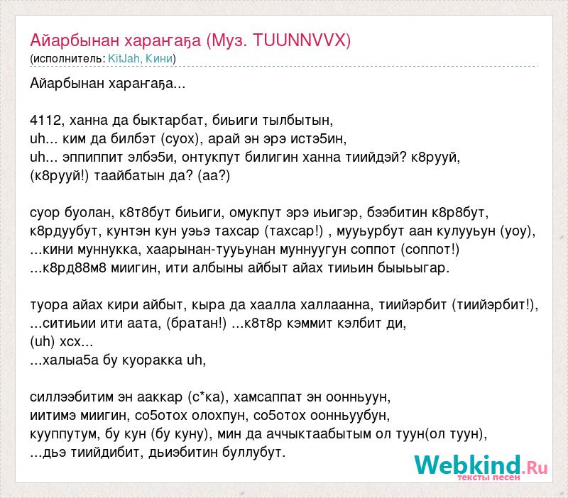 Айарбынан хараҥаҕа... 4112, ханна да быктарбат, биьиги тылбытын, uh... ким да билбэт (суох), арай эн эрэ истэ5ин, uh... эппиппит элбэ5и, онтукпут билигин ханна тиийдэй? к8рууй, (к8рууй!) таайбатын да? (аа?) суор буолан, к8т8бут биьиги, омукпут эрэ иьигэр, бээбитин к8р8бут, к8рдуубут, кунтэн кун уэьэ тахсар (тахсар!) , мууьурбут аан кулууьун (уоу), ...кини муннукка, хаарынан-тууьунан муннуугун соппот (соппот!) ...к8рд88м8 миигин, ити албыны айбыт айах тииьин быыьыгар. туора айах кири айбыт, кыра да хаалла халлаанна, тиийэрбит (тиийэрбит!), ...ситиьии ити аата, (братан!) ...к8т8р кэммит кэлбит ди, (uh) хсх... ...халыа5а бу куоракка uh, силлээбитим эн ааккар (с*ка), хамсаппат эн оонньуун, иитимэ миигин, со5отох олохпун, со5отох оонньуубун, кууппутум, бу кун (бу куну), мин да аччыктаабытым ол туун(ол туун), ...дьэ тиийдибит, дьиэбитин буллубут.