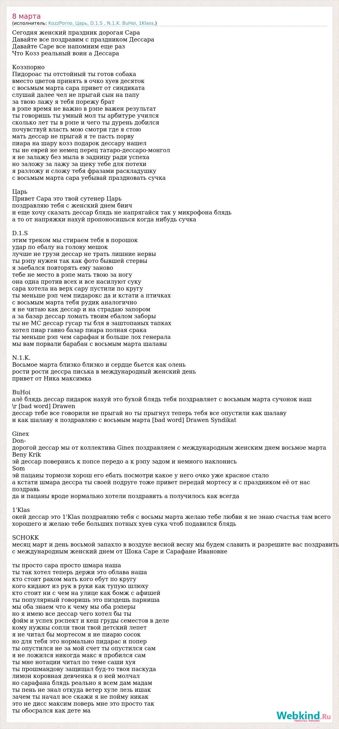 Сегодня женский праздник дорогая Сара Давайте все поздравим с праздником Дессара Давайте Саре все напомним еще раз Что Козз реальный воин а Дессара Коззпорно Пидороас ты отстойный ты готов собака вместо цветов принять в очко хуев десяток с восьмым марта сара привет от синдиката слушай далее чел не прыгай сын на папу за твою лажу я тебя порежу брат в рэпе время не важно в рэпе важен результат ты говоришь ты умный мол ты арбитуре учился сколько лет ты в рэпе и чего ты дурень добился почувствуй власть мою смотри где я стою мать дессар не прыгай я те пасть порву пиара на шару козз подарок дессару нашел ты не еврей не немец перец татаро-дессаро-монгол я не залажу без мыла в задницу ради успеха но заложу за лажу за щеку тебе для потехи я разложу и сложу тебя фразами раскладушку с восьмым марта сара уебывай праздновать сучка Царь Привет Сара это твой сутенер Царь поздравляю тебя с женский днем биич и еще хочу сказать дессар блядь не напрягайся так у микрофона блядь а то от напряжки нахуй пропоносишься когда нибудь сучка D.1.S этим треком мы стираем тебя в порошок удар по ебалу на голову мешок лучше не грузи дессар не трать лишние нервы ты рэпу нужен так как фото бывшей стервы я заебался повторять ему заново тебе не место в рэпе мать твою за ногу она одна против всех и все насилуют суку сара хотела на верх сару пустили по кругу ты меньше рэп чем пидарокс да и кстати а птичках с восьмым марта тебя рудик аналогично я не читаю как дессар и на страдаю запором а за базар дессар ломать твоим ебалом заборы ты не МС дессар гусар ты бля в заштопаных тапках хотел пиар гавно базар пиара полная срака ты меньше рэп чем сарафан и больше лох генерала мы вам порвали барабан с восьмым марта шалавы N.1.K. Восьмое марта близко близко и сердце бьется как олень рости рости дессра писька в международный женский день привет от Ника максимка BuHoi алё блядь дессар пидарок нахуй это бухой блядь тебя поздравляет с восьмым марта сучонок наш \r [bad word] Drawen дессар тебе все говорили не прыгай но ты прыгнул теперь тебя все опустили как шалаву и как шалаву я поздравляю с восьмым марта [bad word] Drawen Syndikat Ginex Don- дорогой дессар мы от коллектива Ginex поздравляем с международным женским днем восьмое марта Beny Krik эй дессар повернись к попсе передо а к рэпу задом и немного наклонись Som эй пацаны тормози хорош его ебать посмотри какое у него очко уже красное стало а кстати шмара дессра ты своей подруге тоже привет передай мортесу и с праздником её от нас поздравь да и пацаны вроде нормально хотели поздравить а получилось как всегда 1'Klas окей дессар это 1'Klas поздравляю тебя с восьмы марта желаю тебе любви я не знаю счастья там всего хорошего и желаю тебе больших потных хуев сука чтоб подавился блядь SCHOKK месяц март и день восьмой запахло в воздухе весной весну мы будем славить и разрешите вас поздравить с международным женский днем от Шока Саре и Сарафане Ивановне ты просто сара просто шмара наша ты так хотел теперь держи это облава наша кто стоит раком мать кого ебут по кругу кого кидают из рук в руки как тупую шлюху кто стоит ни с чем на улице как бомж с афишей ты популярный говоришь это пиздешь парниша мы оба знаем что к чему мы оба рэперы но я имею все дессар чего хотел бы ты фэйм и успех рэспект и кеш груды семестов в деле кому нужны сопли твои твой детский лепет я не читал бы мортесом я не пиарю сосок но