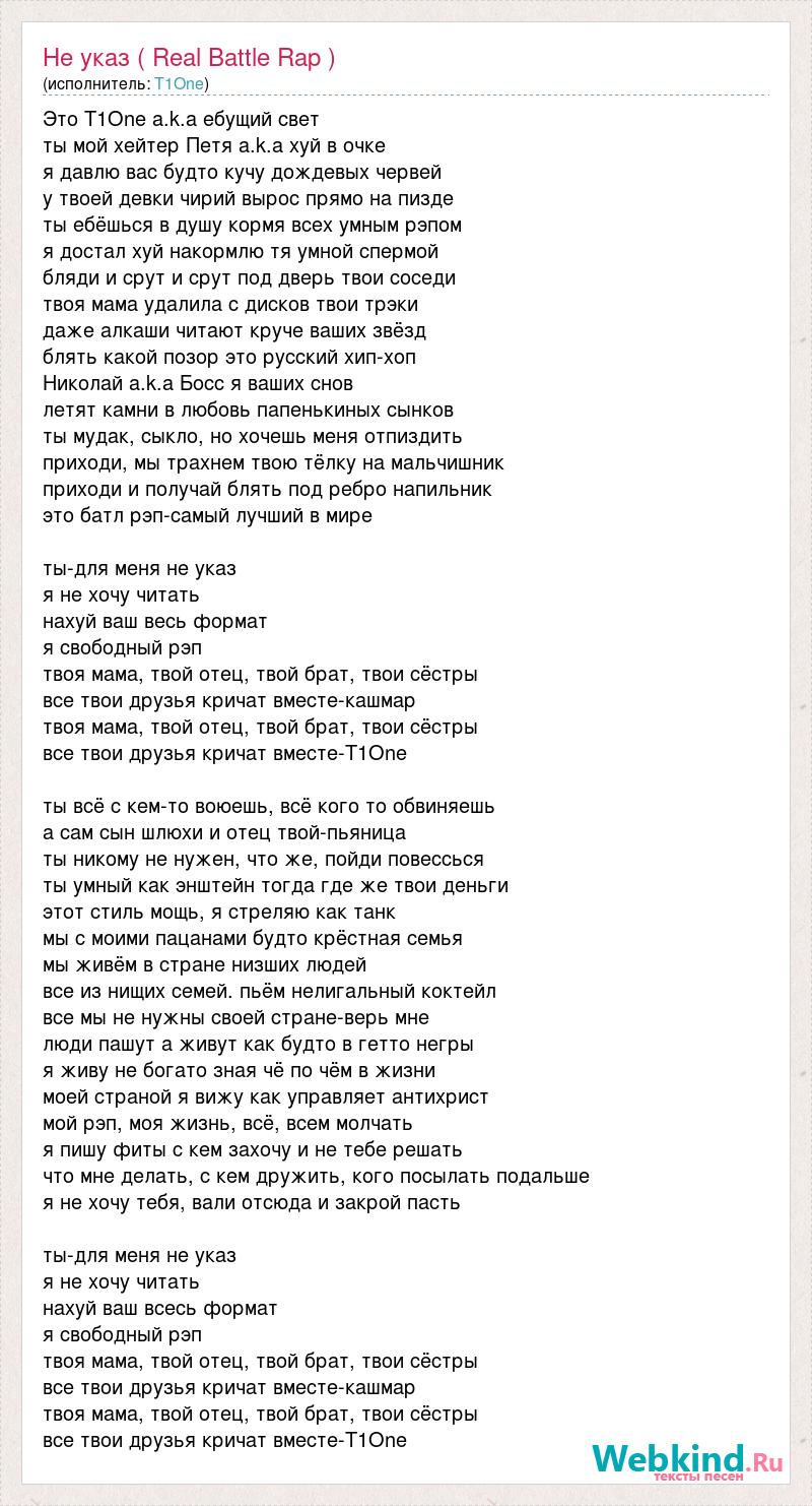 Это T1One a.k.a ебущий свет ты мой хейтер Петя a.k.a хуй в очке я давлю вас будто кучу дождевых червей у твоей девки чирий вырос прямо на пизде ты ебёшься в душу кормя всех умным рэпом я достал хуй накормлю тя умной спермой бляди и срут и срут под дверь твои соседи твоя мама удалила с дисков твои трэки даже алкаши читают круче ваших звёзд блять какой позор это русский хип-хоп Николай a.k.a Босс я ваших снов летят камни в любовь папенькиных сынков ты мудак, сыкло, но хочешь меня отпиздить приходи, мы трахнем твою тёлку на мальчишник приходи и получай блять под ребро напильник это батл рэп-самый лучший в мире ты-для меня не указ я не хочу читать нахуй ваш весь формат я свободный рэп твоя мама, твой отец, твой брат, твои сёстры все твои друзья кричат вместе-кашмар твоя мама, твой отец, твой брат, твои сёстры все твои друзья кричат вместе-T1One ты всё с кем-то воюешь, всё кого то обвиняешь а сам сын шлюхи и отец твой-пьяница ты никому не нужен, что же, пойди повессься ты умный как энштейн тогда где же твои деньги этот стиль мощь, я стреляю как танк мы с моими пацанами будто крёстная семья мы живём в стране низших людей все из нищих семей. пьём нелигальный коктейл все мы не нужны своей стране-верь мне люди пашут а живут как будто в гетто негры я живу не богато зная чё по чём в жизни моей страной я вижу как управляет антихрист мой рэп, моя жизнь, всё, всем молчать я пишу фиты с кем захочу и не тебе решать что мне делать, с кем дружить, кого посылать подальше я не хочу тебя, вали отсюда и закрой пасть ты-для меня не указ я не хочу читать нахуй ваш всесь формат я свободный рэп твоя мама, твой отец, твой брат, твои сёстры все твои друзья кричат вместе-кашмар твоя мама, твой отец, твой брат, твои сёстры все твои друзья кричат вместе-T1One