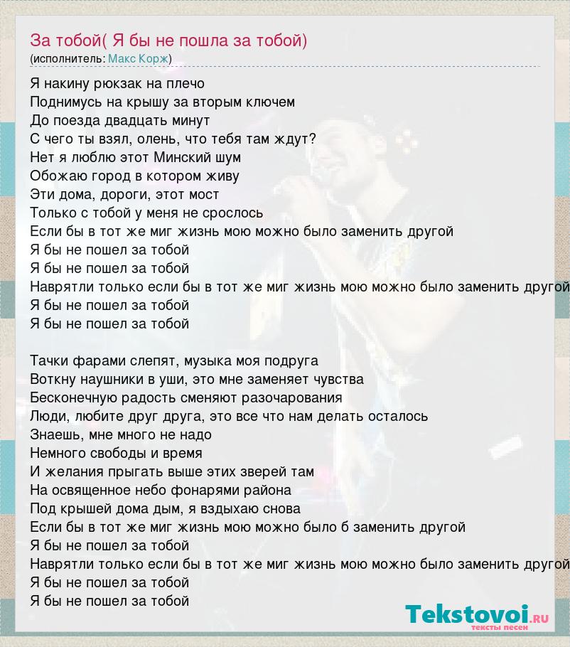 Я накину рюкзак на плечо Поднимусь на крышу за вторым ключем До поезда двадцать минут С чего ты взял, олень, что тебя там ждут? Нет я люблю этот Минский шум Обожаю город в котором живу Эти дома, дороги, этот мост Только с тобой у меня не срослось Если бы в тот же миг жизнь мою можно было заменить другой Я бы не пошел за тобой Я бы не пошел за тобой Наврятли только если бы в тот же миг жизнь мою можно было заменить другой Я бы не пошел за тобой Я бы не пошел за тобой Тачки фарами слепят, музыка моя подруга Воткну наушники в уши, это мне заменяет чувства Бесконечную радость сменяют разочарования Люди, любите друг друга, это все что нам делать осталось Знаешь, мне много не надо Немного свободы и время И желания прыгать выше этих зверей там На освященное небо фонарями района Под крышей дома дым, я вздыхаю снова Если бы в тот же миг жизнь мою можно было б заменить другой Я бы не пошел за тобой Наврятли только если бы в тот же миг жизнь мою можно было заменить другой Я бы не пошел за тобой Я бы не пошел за тобой