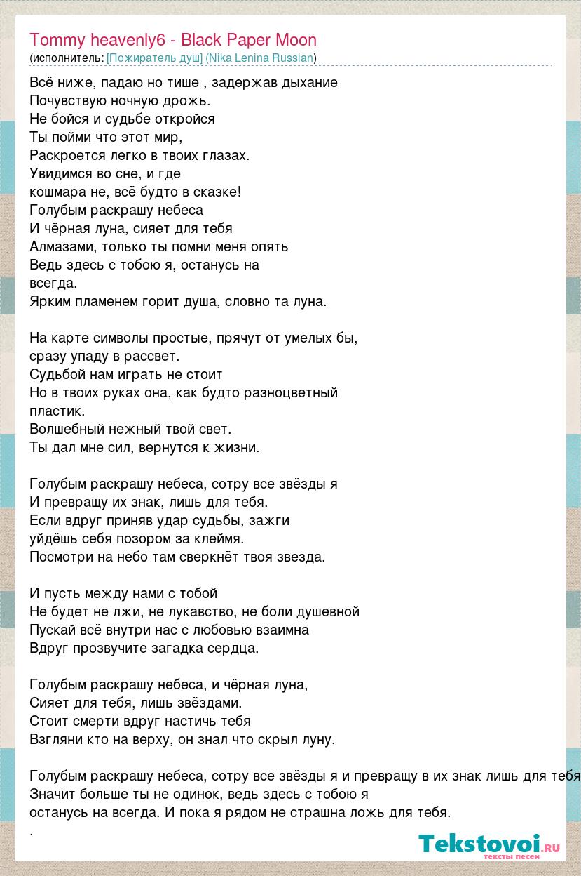 Всё ниже, падаю но тише , задержав дыхание Почувствую ночную дрожь. Не бойся и судьбе откройся Ты пойми что этот мир, Раскроется легко в твоих глазах. Увидимся во сне, и где кошмара не, всё будто в сказке! Голубым раскрашу небеса И чёрная луна, сияет для тебя Алмазами, только ты помни меня опять Ведь здесь с тобою я, останусь на всегда. Ярким пламенем горит душа, словно та луна. На карте символы простые, прячут от умелых бы, сразу упаду в рассвет. Судьбой нам играть не стоит Но в твоих руках она, как будто разноцветный пластик. Волшебный нежный твой свет. Ты дал мне сил, вернутся к жизни. Голубым раскрашу небеса, сотру все звёзды я И превращу их знак, лишь для тебя. Если вдруг приняв удар судьбы, зажги уйдёшь себя позором за клеймя. Посмотри на небо там сверкнёт твоя звезда. И пусть между нами с тобой Не будет не лжи, не лукавство, не боли душевной Пускай всё внутри нас с любовью взаимна Вдруг прозвучите загадка сердца. Голубым раскрашу небеса, и чёрная луна, Сияет для тебя, лишь звёздами. Стоит смерти вдруг настичь тебя Взгляни кто на верху, он знал что скрыл луну. Голубым раскрашу небеса, сотру все звёзды я и превращу в их знак лишь для тебя Значит больше ты не одинок, ведь здесь с тобою я останусь на всегда. И пока я рядом не страшна ложь для тебя. .