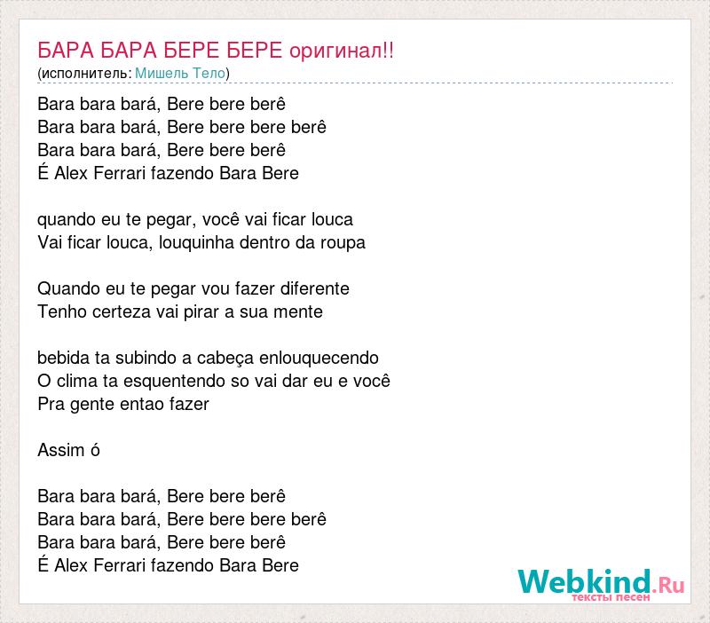 Bara bara bará, Bere bere berê Bara bara bará, Bere bere bere berê Bara bara bará, Bere bere berê É Alex Ferrari fazendo Bara Bere quando eu te pegar, você vai ficar louca Vai ficar louca, louquinha dentro da roupa Quando eu te pegar vou fazer diferente Tenho certeza vai pirar a sua mente bebida ta subindo a cabeça enlouquecendo O clima ta esquentendo so vai dar eu e você Pra gente entao fazer Assim ó Bara bara bará, Bere bere berê Bara bara bará, Bere bere bere berê Bara bara bará, Bere bere berê É Alex Ferrari fazendo Bara Bere