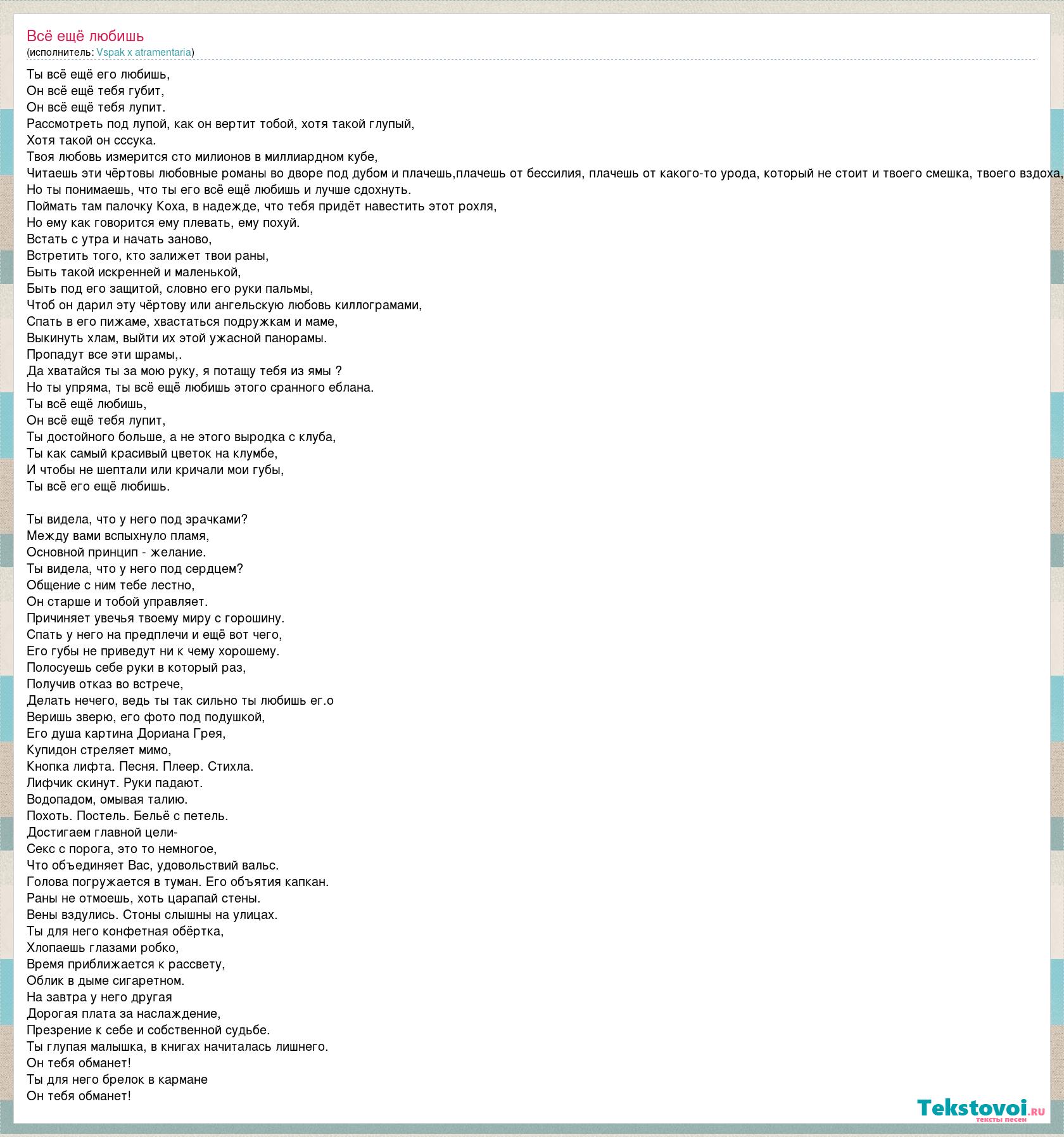 Ты всё ещё его любишь, Он всё ещё тебя губит, Он всё ещё тебя лупит. Рассмотреть под лупой, как он вертит тобой, хотя такой он глупый, Хотя такой он сссука. Твоя любовь измерится сто милионов в миллиардном кубе, Читаешь эти чёртовы любовные романы во дворе под дубом и плачешь,плачешь от бессилия, плачешь от какого-то урода, который не стоит и твоего смешка, твоего маленького вздоха, Но ты понимаешь, что ты его всё ещё любишь и лучше сдохнуть. Поймать там палочку Коха, в надежде, в маленькой надежде что тебя придёт навестить этот рохля, Но ему как говорится ему похуй, плевать. Встать с утра и начать заново, Встретить того, кто залижет твои раны, Быть такой искренней и маленькой, Быть под его защитой, словно его руки пальмы, Чтоб он дарил эту чёртову или ангельскую любовь киллограмами, Спать в его пижаме, хвастаться подружкам и маме, Выкинуть хлам, выйти их этой ужасной панорамы. Пропадут все эти шрамы,. Да хватайся ты за мою руку, я потащу тебя из ямы Но ты упряма, ты всё ещё любишь этого еблана. Ты всё ещё любишь, Он всё ещё тебя лупит, Ты достойного больше, а не этого выродка с клуба, Ты как самый красивый цветок на клумбе, И чтобы не шептали или кричали мои губы, Ты всё его ещё любишь. И плачешь. Ты видела, что у него под зрачками? Между вами вспыхнуло пламя, Основной принцип - желание. Ты видела, что у него под сердцем? Общение с ним тебе лестно, Он старше и тобой управляет. Причиняет увечья твоему миру с горошину. Спать у него на предплечи и ещё вот чего, Его губы не приведут ни к чему хорошему. Полосуешь себе руки в который раз, Получив отказ во встрече, Делать нечего, ведь ты так сильно ты любишь его Веришь зверю, его фото под подушкой, Его душа картина Дориана Грея, Купидон стреляет мимо, Кнопка лифта. Песня. Плеер. Стихла. Лифчик скинут. Руки падают. Водопадом, омывая талию. Похоть. Постель. Бельё с петель. Достигаем главной цели- Секс с порога, это то немногое, Что объединяет Вас, удовольствий вальс. Голова погружается в туман. Его объятия капкан. Раны не отмоешь, хоть царапай стены. Вены вздулись. Стоны слышны на улицах. Ты для него конфетная обёртка, Хлопаешь глазами робко, Время приближается к рассвету, Облик в дыме сигаретном. На завтра у него другая Дорогая плата за наслаждение, Презрение к себе и собственной судьбе. Ты глупая малышка, в книгах начиталась лишнего. Он не стоит и твоего смешка. Твоего вздоха.