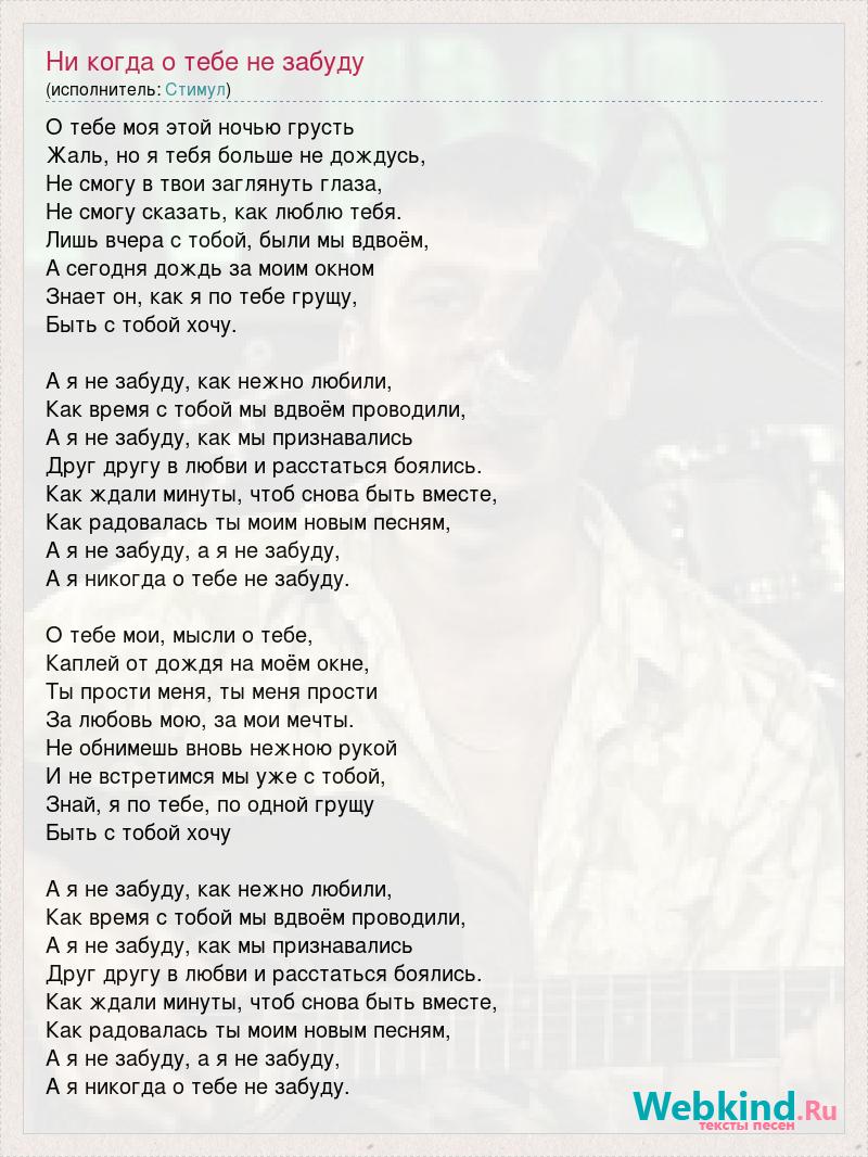 О тебе моя этой ночью грусть Жаль, но я тебя больше не дождусь, Не смогу в твои заглянуть глаза, Не смогу сказать, как люблю тебя. Лишь вчера с тобой, были мы вдвоём, А сегодня дождь за моим окном Знает он, как я по тебе грущу, Быть с тобой хочу. А я не забуду, как нежно любили, Как время с тобой мы вдвоём проводили, А я не забуду, как мы признавались Друг другу в любви и расстаться боялись. Как ждали минуты, чтоб снова быть вместе, Как радовалась ты моим новым песням, А я не забуду, а я не забуду, А я никогда о тебе не забуду. О тебе мои, мысли о тебе, Каплей от дождя на моём окне, Ты прости меня, ты меня прости За любовь мою, за мои мечты. Не обнимешь вновь нежною рукой И не встретимся мы уже с тобой, Знай, я по тебе, по одной грущу Быть с тобой хочу А я не забуду, как нежно любили, Как время с тобой мы вдвоём проводили, А я не забуду, как мы признавались Друг другу в любви и расстаться боялись. Как ждали минуты, чтоб снова быть вместе, Как радовалась ты моим новым песням, А я не забуду, а я не забуду, А я никогда о тебе не забуду.