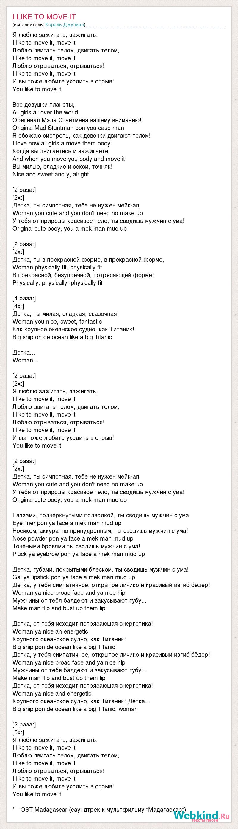 Я люблю зажигать, зажигать, I like to move it, move it Люблю двигать телом, двигать телом, I like to move it, move it Люблю отрываться, отрываться! I like to move it, move it И вы тоже любите уходить в отрыв! You like to move it Все девушки планеты, All girls all over the world Оригинал Мэда Стантмена вашему вниманию! Original Mad Stuntman pon you case man Я обожаю смотреть, как девочки двигают телом! I love how all girls a move them body Когда вы двигаетесь и зажигаете, And when you move you body and move it Вы милые, сладкие и секси, точняк! Nice and sweet and y, alright [2 раза:] [2x:] Детка, ты симпотная, тебе не нужен мейк-ап, Woman you cute and you don't need no make up У тебя от природы красивое тело, ты сводишь мужчин с ума! Original cute body, you a mek man mud up [2 раза:] [2x:] Детка, ты в прекрасной форме, в прекрасной форме, Woman physically fit, physically fit В прекрасной, безупречной, потрясающей форме! Physically, physically, physically fit [4 раза:] [4x:] Детка, ты милая, сладкая, сказочная! Woman you nice, sweet, fantastic Как крупное океанское судно, как Титаник! Big ship on de ocean like a big Titanic Детка... Woman... [2 раза:] [2x:] Я люблю зажигать, зажигать, I like to move it, move it Люблю двигать телом, двигать телом, I like to move it, move it Люблю отрываться, отрываться! I like to move it, move it И вы тоже любите уходить в отрыв! You like to move it [2 раза:] [2x:] Детка, ты симпотная, тебе не нужен мейк-ап, Woman you cute and you don't need no make up У тебя от природы красивое тело, ты сводишь мужчин с ума! Original cute body, you a mek man mud up Глазами, подчёркнутыми подводкой, ты сводишь мужчин с ума! Eye liner pon ya face a mek man mud up Носиком, аккуратно припудренным, ты сводишь мужчин с ума! Nose powder pon ya face a mek man mud up Точёными бровями ты сводишь мужчин с ума! Pluck ya eyebrow pon ya face a mek man mud up Детка, губами, покрытыми блеском, ты сводишь мужчин с ума! Gal ya lipstick pon ya face a mek man mud up Детка, у тебя симпатичное, открытое личико и красивый изгиб бёдер! Woman ya nice broad face and ya nice hip Мужчины от тебя балдеют и закусывают губу... Make man flip and bust up them lip Детка, от тебя исходит потрясающая энергетика! Woman ya nice an energetic Крупного океанское судно, как Титаник! Big ship pon de ocean like a big Titanic Детка, у тебя симпатичное, открытое личико и красивый изгиб бёдер! Woman ya nice broad face and ya nice hip Мужчины от тебя балдеют и закусывают губу... Make man flip and bust up them lip Детка, от тебя исходит потрясающая энергетика! Woman ya nice and energetic Крупного океанское судно, как Титаник! Детка... Big ship pon de ocean like a big Titanic, woman [2 раза:] [6x:] Я люблю зажигать, зажигать, I like to move it, move it Люблю двигать телом, двигать телом, I like to move it, move it Люблю отрываться, отрываться! I like to move it, move it И вы тоже любите уходить в отрыв! You like to move it * - OST Madagascar (cаундтрек к мультфильму "Мадагаскар")