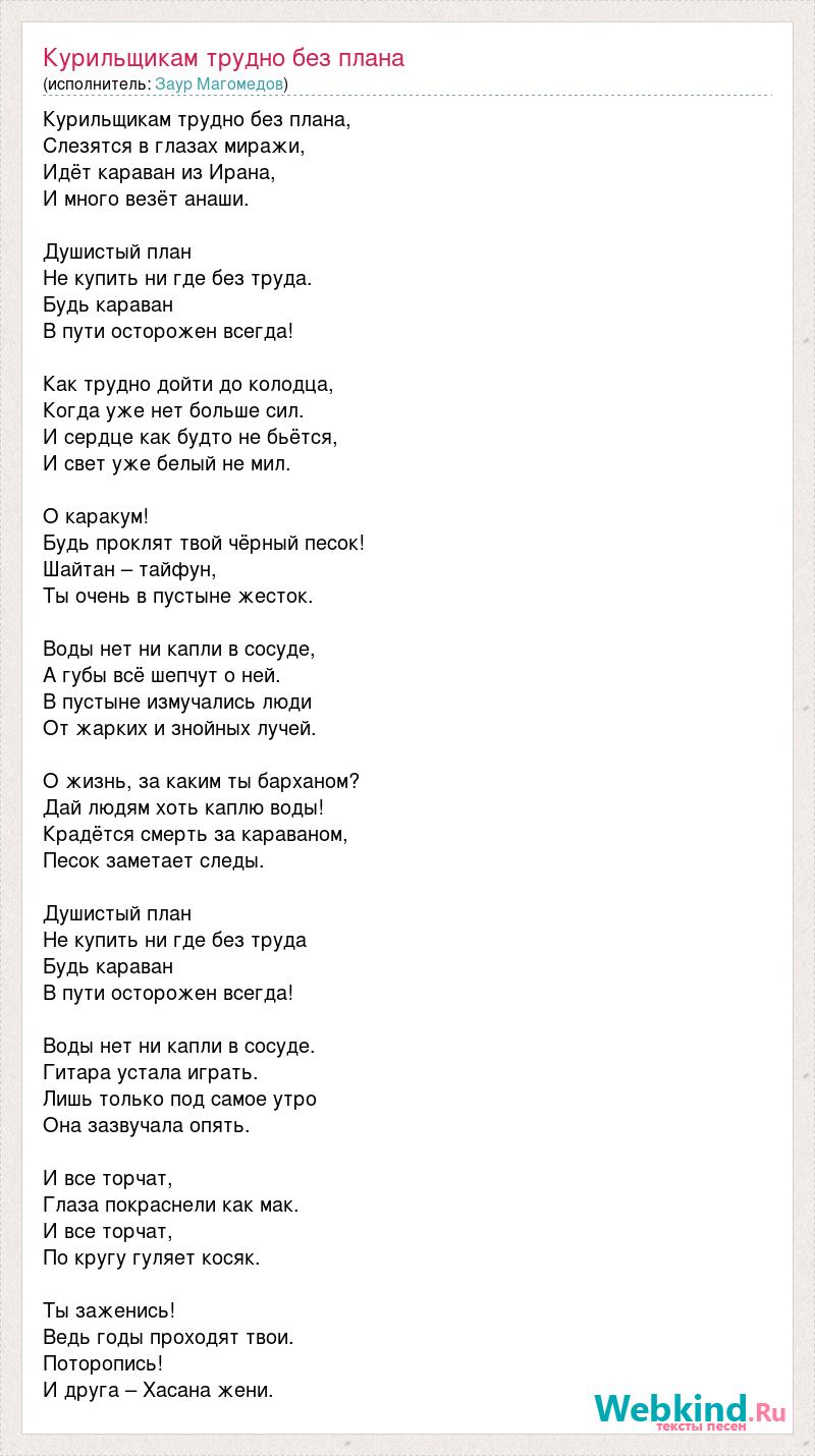 Курильщикам трудно без плана, Слезятся в глазах миражи, Идёт караван из Ирана, И много везёт анаши. Душистый план Не купить ни где без труда. Будь караван В пути осторожен всегда! Как трудно дойти до колодца, Когда уже нет больше сил. И сердце как будто не бьётся, И свет уже белый не мил. О каракум! Будь проклят твой чёрный песок! Шайтан – тайфун, Ты очень в пустыне жесток. Воды нет ни капли в сосуде, А губы всё шепчут о ней. В пустыне измучались люди От жарких и знойных лучей. О жизнь, за каким ты барханом? Дай людям хоть каплю воды! Крадётся смерть за караваном, Песок заметает следы. Душистый план Не купить ни где без труда Будь караван В пути осторожен всегда! Воды нет ни капли в сосуде. Гитара устала играть. Лишь только под самое утро Она зазвучала опять. И все торчат, Глаза покраснели как мак. И все торчат, По кругу гуляет косяк. Ты заженись! Ведь годы проходят твои. Поторопись! И друга – Хасана жени.