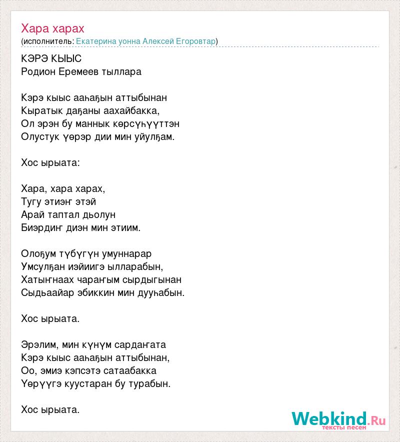 КЭРЭ КЫЫС Родион Еремеев тыллара Кэрэ кыыс ааһаҕын аттыбынан Кыратык даҕаны аахайбакка, Ол эрэн бу маннык көрсүһүүттэн Олустук үөрэр дии мин уйулҕам. Хос ырыата: Хара, хара харах, Тугу этиэҥ этэй Арай таптал дьолун Биэрдиҥ диэн мин этиим. Олоҕум түбүгүн умуннарар Умсулҕан иэйиигэ ылларабын, Хатыҥнаах чараҥым сырдыгынан Сыдьаайар эбиккин мин дууһабын. Хос ырыата. Эрэлим, мин күнүм сардаҥата Кэрэ кыыс ааһаҕын аттыбынан, Оо, эмиэ кэпсэтэ сатаабакка Үөрүүгэ куустаран бу турабын. Хос ырыата.