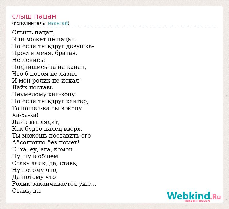 Слышь пацан, Или может не пацан. Но если ты вдруг девушка- Прости меня, братан. Не ленись: Подпишись-ка на канал, Что б потом не лазил И мой ролик не искал! Лайк поставь Неумелому хип-хопу. Но если ты вдруг хейтер, То пошел-ка ты в жопу Ха-ха-ха! Лайк выглядит, Как будто палец вверх. Ты можешь поставить его Абсолютно без помех! Е, ха, еу, ага, комон... Ну, ну в общем Ставь лайк, да, ставь, Ну потому что, Да потому что Ролик заканчивается уже... Ставь, да.