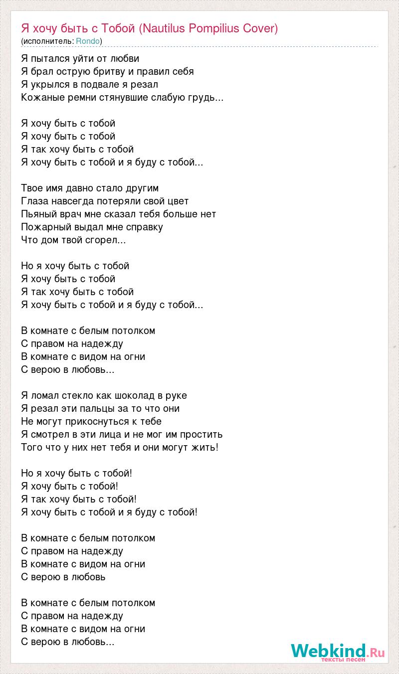 Я пытался уйти от любви Я брал острую бритву и правил себя Я укрылся в подвале я резал Кожаные ремни стянувшие слабую грудь... Я хочу быть с тобой Я хочу быть с тобой Я так хочу быть с тобой Я хочу быть с тобой и я буду с тобой... Твое имя давно стало другим Глаза навсегда потеряли свой цвет Пьяный врач мне сказал тебя больше нет Пожарный выдал мне справку Что дом твой сгорел... Но я хочу быть с тобой Я хочу быть с тобой Я так хочу быть с тобой Я хочу быть с тобой и я буду с тобой... В комнате с белым потолком С правом на надежду В комнате с видом на огни С верою в любовь... Я ломал стекло как шоколад в руке Я резал эти пальцы за то что они Не могут прикоснуться к тебе Я смотрел в эти лица и не мог им простить Того что у них нет тебя и они могут жить! Но я хочу быть с тобой! Я хочу быть с тобой! Я так хочу быть с тобой! Я хочу быть с тобой и я буду с тобой! В комнате с белым потолком С правом на надежду В комнате с видом на огни С верою в любовь В комнате с белым потолком С правом на надежду В комнате с видом на огни С верою в любовь...