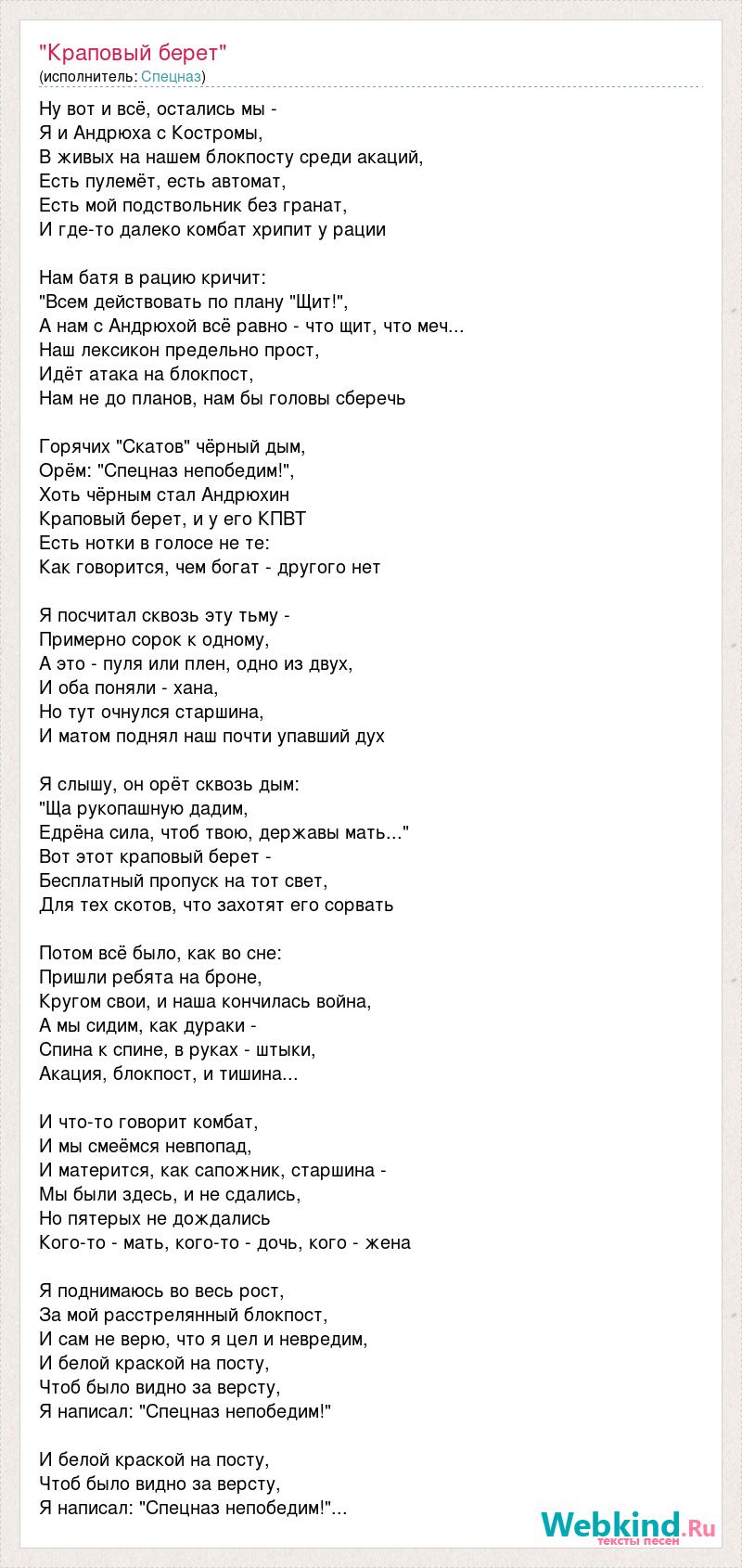 Ну вот и всё, остались мы - Я и Андрюха с Костромы, В живых на нашем блокпосту cреди акаций, Есть пулемёт, есть автомат, Есть мой подствольник без гранат, И где-то далеко комбат хрипит у рации Нам батя в рацию кричит: "Всем действовать по плану "Щит!", А нам с Андрюхой всё равно - что щит, что меч... Наш лексикон предельно прост, Идёт атака на блокпост, Нам не до планов, нам бы головы сберечь Горячих "Скатов" чёрный дым, Орём: "Спецназ непобедим!", Хоть чёрным стал Андрюхин Краповый берет, и у его КПВТ Есть нотки в голосе не те: Как говорится, чем богат - другого нет Я посчитал сквозь эту тьму - Примерно сорок к одному, А это - пуля или плен, одно из двух, И оба поняли - хана, Но тут очнулся старшина, И матом поднял наш почти упавший дух Я слышу, он орёт сквозь дым: "Ща рукопашную дадим, Едрёна сила, чтоб твою, державы мать..." Вот этот краповый берет - Бесплатный пропуск на тот свет, Для тех скотов, что захотят его сорвать Потом всё было, как во сне: Пришли ребята на броне, Кругом свои, и наша кончилась война, А мы сидим, как дураки - Спина к спине, в руках - штыки, Акация, блокпост, и тишина... И что-то говорит комбат, И мы смеёмся невпопад, И матерится, как сапожник, старшина - Мы были здесь, и не сдались, Но пятерых не дождались Кого-то - мать, кого-то - дочь, кого - жена Я поднимаюсь во весь рост, За мой расстрелянный блокпост, И сам не верю, что я цел и невредим, И белой краской на посту, Чтоб было видно за версту, Я написал: "Спецназ непобедим!" И белой краской на посту, Чтоб было видно за версту, Я написал: "Спецназ непобедим!"...