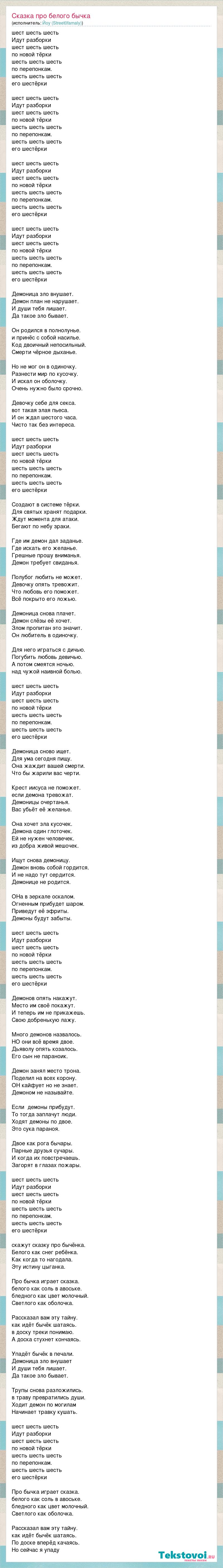 шест шесть шесть Идут разборки шест шесть шесть по новой тёрки шесть шесть шесть по перепонкам. шесть шесть шесть его шестёрки шест шесть шесть Идут разборки шест шесть шесть по новой тёрки шесть шесть шесть по перепонкам. шесть шесть шесть его шестёрки шест шесть шесть Идут разборки шест шесть шесть по новой тёрки шесть шесть шесть по перепонкам. шесть шесть шесть его шестёрки шест шесть шесть Идут разборки шест шесть шесть по новой тёрки шесть шесть шесть по перепонкам. шесть шесть шесть его шестёрки Демоница зло внушает. Демон план не нарушает. И души тебя лишает. Да такое зло бывает. Он родился в полнолунье. и принёс с собой насилье. Код двоичный непосильный. Смерти чёрное дыханье. Но не мог он в одиночку. Разнести мир по кусочку. И искал он оболочку. Очень нужно было срочно. Девочку себе для секса. вот такая злая пьеса. И он ждал шестого часа. Чисто так без интереса. шест шесть шесть Идут разборки шест шесть шесть по новой тёрки шесть шесть шесть по перепонкам. шесть шесть шесть его шестёрки Создают в системе тёрки. Для святых хранят подарки. Ждут момента для атаки. Бегают по небу зраки. Где им демон дал заданье. Где искать его желанье. Грешные прошу вниманья. Демон требует свиданья. Полубог любить не может. Девочку опять тревожит. Что любовь его поможет. Всё покрыто его ложью. Демоница снова плачет. Демон слёзы её хочет. Злом пропитан это значит. Он любитель в одиночку. Для него играться с дичью. Погубить любовь девичью. А потом смеятся ночью. над чужой наивной болью. шест шесть шесть Идут разборки шест шесть шесть по новой тёрки шесть шесть шесть по перепонкам. шесть шесть шесть его шестёрки Демоница сново ищет. Для ума сегодня пищу. Она жаждит вашей смерти. Что бы жарили вас черти. Крест иисуса не поможет. если демона тревожат. Демоницы очертанья. Вас убьёт её желанье. Она хочет зла кусочек. Демона один глоточек. Ей не нужен человечек. из добра живой мешочек. Ищут снова демоницу. Демон вновь собой гордится. И не надо тут сердится. Демонице не родится. ОНа в зеркале оскалом. Огненным прибудет шаром. Приведут её эфриты. Демоны будут забыты. шест шесть шесть Идут разборки шест шесть шесть по новой тёрки шесть шесть шесть по перепонкам. шесть шесть шесть его шестёрки Демонов опять накажут. Место им своё покажут. И теперь им не прикажешь. Свою добренькую лажу. Много демонов назвалось. НО они всё время двое. Дьяволу опять козалось. Его сын не параноик. Демон занял место трона. Поделил на всех корону. ОН кайфует но не знает. Демоном не называйте. Если демоны прибудут. То тогда заплачут люди. Ходят демоны по двое. Это сука параноя. Двое как рога бычары. Парные друзья сучары. И когда их повстречаешь. Загорят в глазах пожары. шест шесть шесть Идут разборки шест шесть шесть по новой тёрки шесть шесть шесть по перепонкам. шесть шесть шесть его шестёрки скажут сказку про бычёнка. Белого как снег ребёнка. Как когда то нагодала. Эту истину цыганка. Про бычка играет сказка. белого как соль в авоське. бледного как цвет молочный. Светлого как оболочка. Рассказал вам эту тайну. как идёт бычёк шатаясь. в доску треки понимаю. А доска стухнет кончаясь. Упадёт бычёк в печали. Демоница зло внушает И души тебя лишает. Да такое зло бывает. Трупы снова разложились. в траву превратились души. Ходит демон по могилам Начинает травку кушать. шест шесть шесть Идут разборки шест шесть 