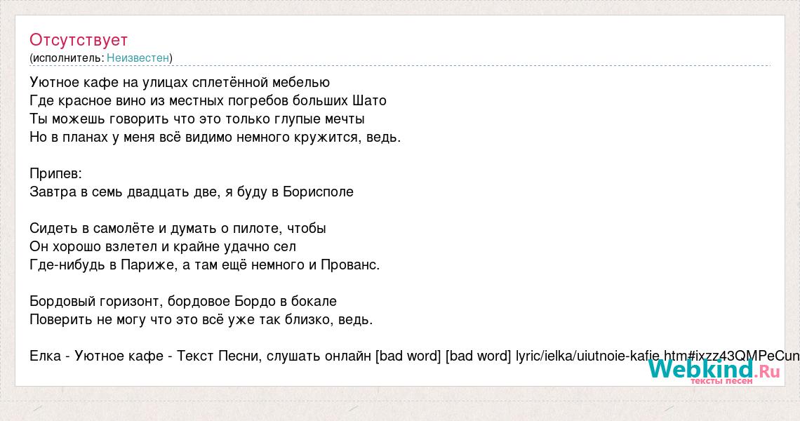 Уютное кафе на улицах сплетённой мебелью Где красное вино из местных погребов больших Шато Ты можешь говорить что это только глупые мечты Но в планах у меня всё видимо немного кружится, ведь. Припев: Завтра в семь двадцать две, я буду в Борисполе Сидеть в самолёте и думать о пилоте, чтобы Он хорошо взлетел и крайне удачно сел Где-нибудь в Париже, а там ещё немного и Прованс. Бордовый горизонт, бордовое Бордо в бокале Поверить не могу что это всё уже так близко, ведь. Елка - Уютное кафе - Текст Песни, слушать онлайн [bad word] [bad word] lyric/ielka/uiutnoie-kafie.htm#ixzz43QMPeCun