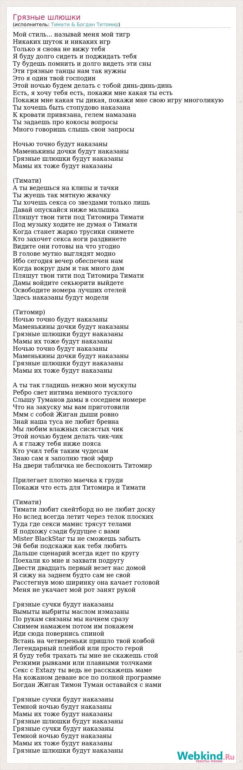 Мой стиль... называй меня мой тигр Никаких шуток и никаких игр Только я снова не вижу тебя Я буду долго сидеть и поджидать тебя Ту будешь помнить и долго видеть эти сны Эти грязные танцы нам так нужны Это я один твой господин Этой ночью будем делать с тобой динь-динь-динь Есть, я хочу тебя есть, покажи мне какая ты есть Покажи мне какая ты дикая, покажи мне свою игру многоликую Ты хочешь быть стопудово наказана К кровати привязана, гелем намазана Ты задаешь про кокосы вопросы Много говоришь слышь свои запросы Ночью точно будут наказаны Маменькины дочки будут наказаны Грязные шлюшки будут наказаны Мамы их тоже будут наказаны (Тимати) А ты ведешься на клипы и тачки Ты жуешь так мятную жвачку Ты хочешь секса со звездами только лишь Давай опускайся ниже малышка Пляшут твои тити под Титомира Тимати Под музыку ходите не думая о Тимати Когда станет жарко трусики снимете Кто захочет секса ноги раздвинете Видите они готовы на что угодно В голове мутно выглядят модно Ибо сегодня вечер обеспечен нам Когда вокруг дым и так много дам Пляшут твои тити под Титомира Тимати Дамы войдите секьюрити выйдете Освободите номера лучших отелей Здесь наказаны будут модели (Титомир) Ночью точно будут наказаны Маменькины дочки будут наказаны Грязные шлюшки будут наказаны Мамы их тоже будут наказаны Ночью точно будут наказаны Маменькины дочки будут наказаны Грязные шлюшки будут наказаны Мамы их тоже будут наказаны А ты так гладишь нежно мои мускулы Ребро свет интима немного тусклого Слышу Туманов дамы в соседнем номере Что на закуску мы вам приготовили Ммм с собой Жиган дыши ровно Знай наша туса не любит бревна Мы любим влажных сисястых чик Этой ночью будем делать чик-чик А я глажу тебя ниже пояса Кто учил тебя таким чудесам Знаю сам я заполню твой эфир На двери табличка не беспокоить Титомир Прилегает плотно маечка к груди Покажи что есть для Титомира и Тимати (Тимати) Тимати любит скейтборд но не любит доску Но вслед всегда летит через телок плоских Туда где секси мамис трясут телами Я подхожу сзади будущее с вами Mister BlackStar ты не сможешь забыть Эй беби подскажи как тебя любить Дальше сценарий всегда идет по кругу Поехали ко мне и захвати подругу Двести двадцать первый везет нас домой Я сижу на заднем будто сам не свой Расстегнув мою ширинку она качает головой Меня не укачает мой рот занят рукой Грязные сучки будут наказаны Вымыты выбриты маслом измазаны По рукам связаны мы начнем сразу Снимем намажем потом им покажем Иди сюда повернись спиной Встань на четвереньки пришло твой ковбой Легендарный плейбой или просто герой Я буду тебя трахать ты мне не скажешь стой Резкими рывками или плавными толчками Секс с Extazy ты ведь не расскажешь маме На кожаном деване все по полной программе Богдан Жиган Тимон Туман оставайся с нами Грязные сучки будут наказаны Темной ночью будут наказаны Мамы их тоже будут наказаны Грязные шлюшки будут наказаны Грязные сучки будут наказаны Темной ночью будут наказаны Мамы их тоже будут наказаны Грязные шлюшки будут наказаны
