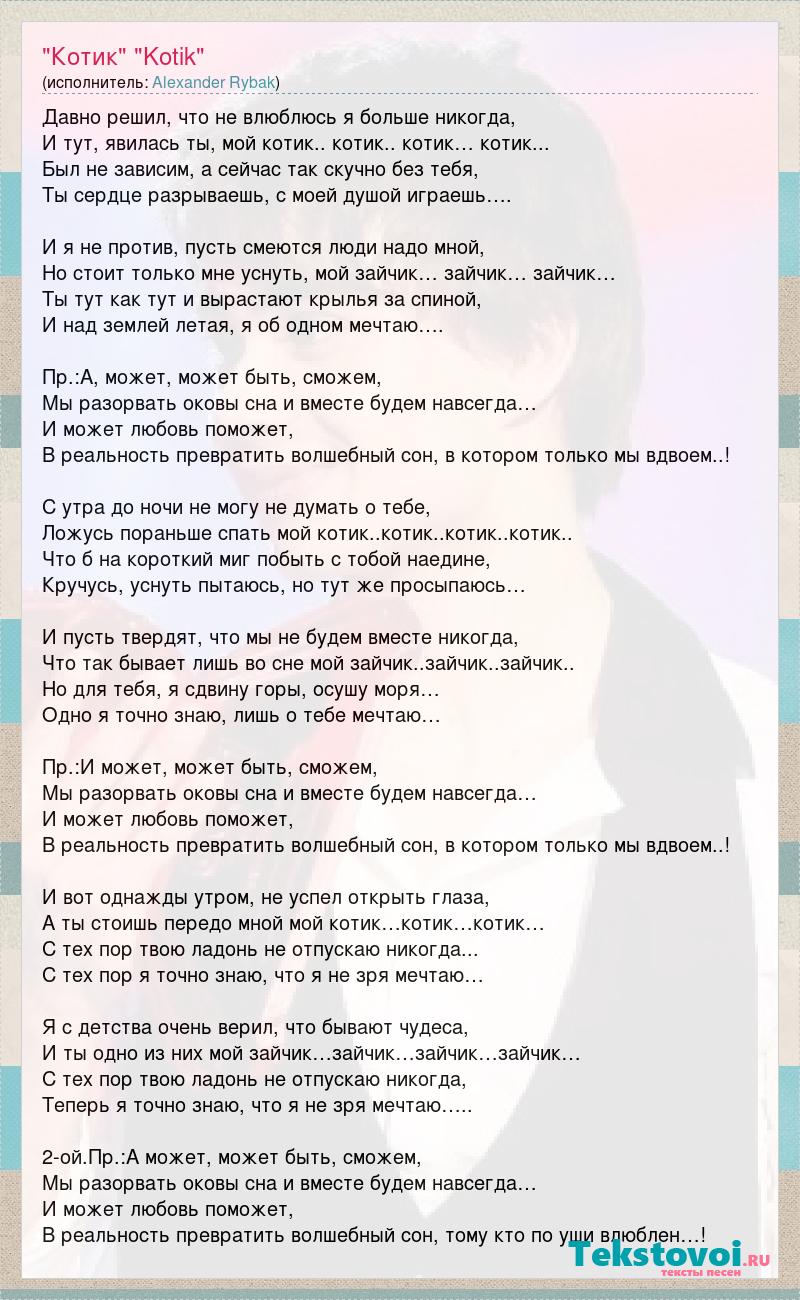 Давно решил, что не влюблюсь я больше никогда, И тут, явилась ты, мой котик.. котик.. котик… котик... Был не зависим, а сейчас так скучно без тебя, Ты сердце разрываешь, с моей душой играешь…. И я не против, пусть смеются люди надо мной, Но стоит только мне уснуть, мой зайчик… зайчик… зайчик… Ты тут как тут и вырастают крылья за спиной, И над землей летая, я об одном мечтаю…. Пр.:А, может, может быть, сможем, Мы разорвать оковы сна и вместе будем навсегда… И может любовь поможет, В реальность превратить волшебный сон, в котором только мы вдвоем..! С утра до ночи не могу не думать о тебе, Ложусь пораньше спать мой котик..котик..котик..котик.. Что б на короткий миг побыть с тобой наедине, Кручусь, уснуть пытаюсь, но тут же просыпаюсь… И пусть твердят, что мы не будем вместе никогда, Что так бывает лишь во сне мой зайчик..зайчик..зайчик.. Но для тебя, я сдвину горы, осушу моря… Одно я точно знаю, лишь о тебе мечтаю… Пр.:И может, может быть, сможем, Мы разорвать оковы сна и вместе будем навсегда… И может любовь поможет, В реальность превратить волшебный сон, в котором только мы вдвоем..! И вот однажды утром, не успел открыть глаза, А ты стоишь передо мной мой котик…котик…котик… С тех пор твою ладонь не отпускаю никогда... С тех пор я точно знаю, что я не зря мечтаю… Я с детства очень верил, что бывают чудеса, И ты одно из них мой зайчик…зайчик…зайчик…зайчик… С тех пор твою ладонь не отпускаю никогда, Теперь я точно знаю, что я не зря мечтаю….. 2-ой.Пр.:А может, может быть, сможем, Мы разорвать оковы сна и вместе будем навсегда… И может любовь поможет, В реальность превратить волшебный сон, тому кто по уши влюблен…!
