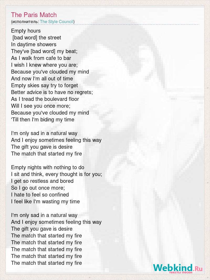 Empty hours [bad word] the street In daytime showers They've [bad word] my beat; As I walk from cafe to bar I wish I knew where you are; Because you've clouded my mind And now I'm all out of time Empty skies say try to forget Better advice is to have no regrets; As I tread the boulevard floor Will I see you once more; Because you've clouded my mind 'Till then I'm biding my time I'm only sad in a natural way And I enjoy sometimes feeling this way The gift you gave is desire The match that started my fire Empty nights with nothing to do I sit and think, every thought is for you; I get so restless and bored So I go out once more; I hate to feel so confined I feel like I'm wasting my time I'm only sad in a natural way And I enjoy sometimes feeling this way The gift you gave is desire The match that started my fire The match that started my fire The match that started my fire The match that started my fire The match that started my fire