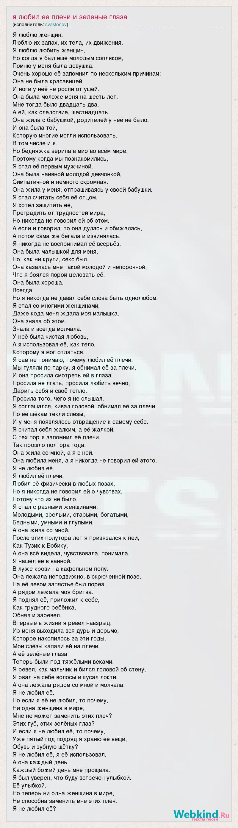 А как ты думаешь, о чем песня "Я любил ее плечи и зеленые глаза" ?